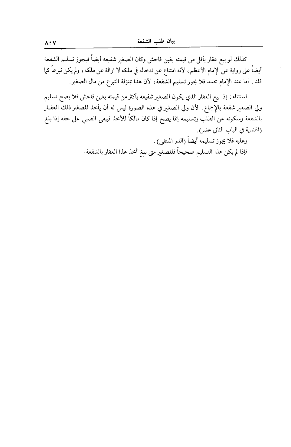 كَذَلِكَ لَوْ بِيعَ عَقَارٌ بِأَقَلَّ مِنْ قِيمَتُهٌ بِغَبْنٍ فَاحِشٍ وَكَانَ الصَّغِيرُ شَفِيعَهُ أَيْضًا فَيَجُوزُ تَسْلِيمُ الشُّفْعَةِ أَيْضًا عَلَى رِوَايَةٍ عَنْ الْإِمَامِ الْأَعْظَمِ؛ لِأَنَّهُ امْتِنَاعٌ عَنْ إدْخَالِهِ فِي مِلْكِهِ لَا إزَالَةٌ عَنْ مِلْكِهِ، وَلَمْ يَكُنْ تَبَرُّعًا كَمَا قُلْنَا. أَمَّا عِنْدَ الْإِمَامِ مُحَمَّدٍ فَلَا يَجُوزُ تَسْلِيمُ الشُّفْعَةِ؛ لِأَنَّ هَذَا بِمَنْزِلَةِ التَّبَرُّعِ مِنْ مَالِ الصَّغِيرِ. اسْتِثْنَاءٌ: إذَا بِيعَ الْعَقَارُ الَّذِي يَكُونُ الصَّغِيرُ شَفِيعَهُ بِأَكْثَرَ مِنْ قِيمَتِهِ بِغَبْنٍ فَاحِشٍ فَلَا يَصِحُّ تَسْلِيمُ وَلِيِّ الصَّغِيرِ شُفْعَةً بِالْإِجْمَاعِ؛ لِأَنَّ وَلِيَّ الصَّغِيرِ فِي هَذِهِ الصُّورَةِ لَيْسَ لَهُ أَنْ يَأْخُذَ لِلصَّغِيرِ ذَلِكَ الْعَقَارَ بِالشُّفْعَةِ، وَسُكُوتُهُ عَنْ الطَّلَبِ وَتَسْلِيمُهُ إنَّمَا يَصِحُّ إذَا كَانَ مَالِكًا لِلْأَخْذِ، فَيَبْقَى الصَّبِيُّ عَلَى حَقِّهِ إذَا بَلَغَ، (الْهِنْدِيَّةُ فِي الْبَابِ الثَّانِي عَشَرَ) . وَعَلَيْهِ فَلَا يَجُوزُ تَسْلِيمُهُ أَيْضًا، (الدُّرُّ الْمُنْتَقَى) .
