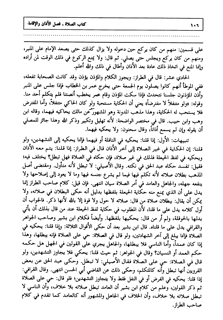 الحادي عشر: قال في الطراز ويجوز الكلام والمؤذن يؤذن وقد كانت الصحابة تفعله ففي الموطأ أنهم كانوا يصلون يوم الجمعة حتى يخرج عمر بن الخطاب فإذا جلس على المنبر وأذن المؤذنون جلسنا نتحدث فإذا سكت المؤذن وقام عمر يخطب أنصتنا فلم يتكلم أحد منا وقوله: ولو متنفلا لا مفترضا يعني أن الحكاية مستحبة ولو كان الحاكي متنفلا وأما المفترض فلا يستحب له الحكاية وهذا مذهب المدونة وهو المشهور عن مالك يحاكيه فيهما وقاله ابن وهب وابن حبيب قال في مختصر الواضحة لأنه تهليل وتكبير وذكر الله وهذا جائز للمصلي أن يقوله: وإن لم يسمع أذانا وقال سحنون ولا يحكيه فيهما.