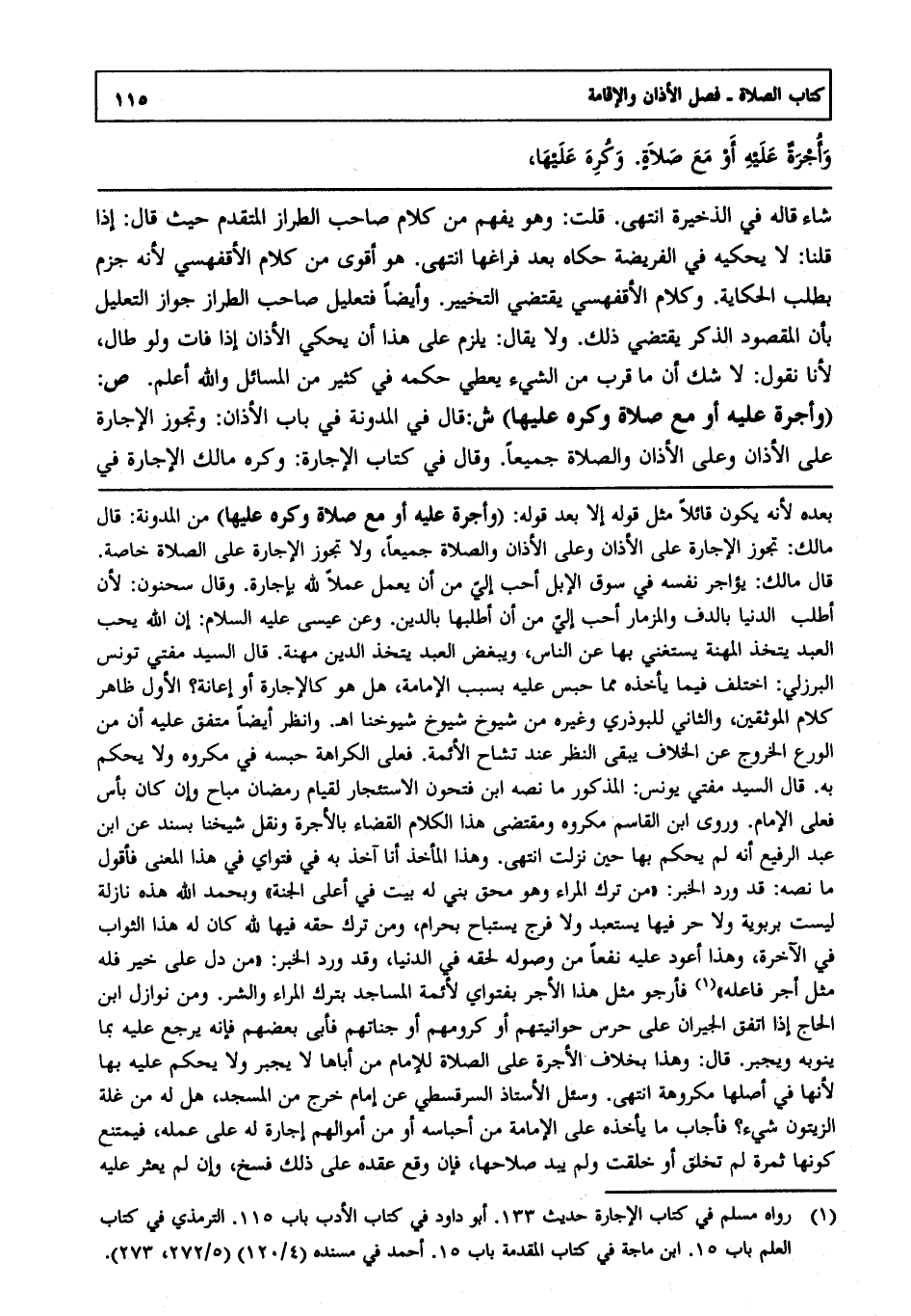 شاء قاله في الذخيرة انتهى قلت: وهو يفهم من كلام صاحب الطراز المتقدم حيث قال إذا قلنا لا يحكيه في الفريضة حكاه بعد فراغها انتهى هو أقوى من كلام الأقفهسي لأنه جزم بطلب الحكاية وكلام الأقفهسي يقتضي التخيير وأيضا فتعليل صاحب الطراز جواز التعليل بأن المقصود الذكر يقتضي ذلك ولا يقال يلزم على هذا أن يحكي الأذان إذا فات ولو طال لأنا نقول لا شك أن ما قرب من الشيء يعطي خكمه في كثير من المسائل والله أعلم ص: وأجرة عليه أو مع صلاة وكره عليها ش: قال في المدونة في باب الأذان وتجوز الإجارة على الأذان وعلى الأذان والصلاة جميعا وقال في كتاب الإجاة وكره مالك الإجارة في