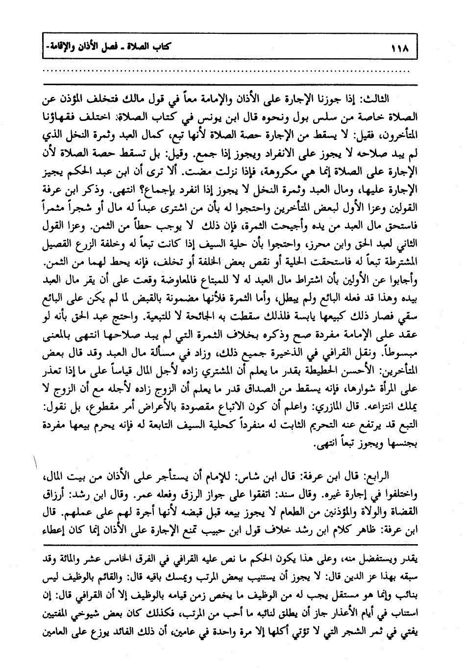 الرابع: قال ابن عرفة قال ابن شاس للإمام أن يستأجر على الأذان من بيت المال واختلفوا في إجارة غيره وقال سند اتفقوا على جواز الرزق وفعله عمر وقال ابن رشد أرزاق القضاة والولاة والمؤذنين من الطعام لا يجوز بيعه قبل قبضه لأنها أجرة لهم على عملهم قال ابن عرفة ظاهر كلام ابن رشد خلاف قول ابن حبيب تمنع الإجارة على الأذان إنما كان إعطاء