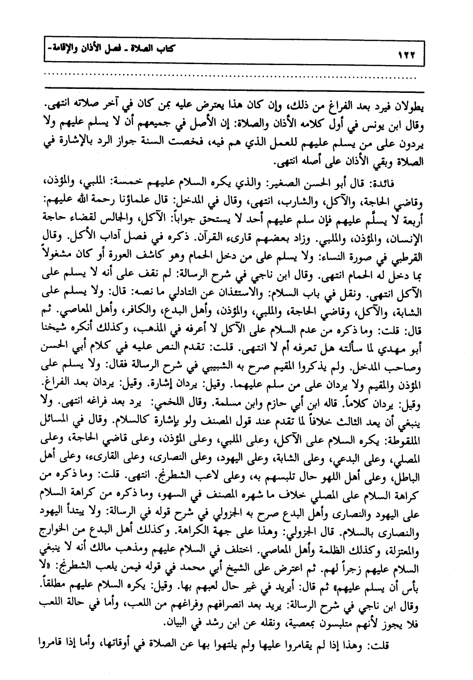 فائدة : قال أبو الحسن الصغير والذي يكره السلام عليهم خمسة الملبي والمؤذن وقاضي الحاجة والآكل والشارب انتهى وقال في المدخل قال علمائنا رحمة الله عليهم أربعة لا يسلم عليهم فإن سلم عليهم أحد لا يستحق جوابا الآكل والجالس لقضاء حاجة الإنسان والمؤذن والملبي وزاد بعضهم قارئ القرآن ذكره في فصل: آداب الأكل وقال القرطبي في صورة النساء ولا يسلم على من دخل الحمام وهو كاشف العورة أو كان مشغولا بما دخل له الحمام انتهى وقال ابن ناجي في شرح الرسالة لم نقف على أنه لا يسلم على الآكل انتهى ونقل في باب السلام والاستئذان عن التادلي ما نصه قال ولا يسلم على الشابة والآكل وقاضي الحاجة والملبي والمؤذن وأهل البدع والكافر وأهل المعاصي ثم قال قلت: وما ذكره من عدم السلام على الآكل لا أعرفه في المذهب وكذلك أنكره شيخنا أبو مهدي لما سألته هل تعرفه أم لا انتهى قلت: تقدم النص عليه في كلام أبي الحسن وصاحب المدخل ولم يذكروا المقيم صرح به الشبيبي في شرح الرسالة فقال ولا يسلم على المؤذن والمقيم ولا يردان على من سلم عليهما وقيل: يردان إشارة وقيل: يرادن وقيل: يردان كلاما قاله ابن أبي حازم وابن مسلمة وقال اللخمي يرد بعد فراغه انتهى ولا ينبغي أن يعد الثالث خلافا لما تقدم عند قول المصنف ولو بإشارة كالسلام وقال في المسائل الملقوطة يكره السلام على الآكل وعلى الملبي وعلى المؤذن وعلى قاضي الحاجة وعلى المصلي وعلى البدعي وعلى الشابة وعلى اليهود وعلى النصارى وعلى القارئ وعلى أهل الباطل وعلى أهل اللهو حال تلبسهم به وعلى لاعب الشطرنج انتهى قلت: وما ذكره من كراهة السلام على المصلي خلاف ما شهره المصنف في السهو وما ذكره من كراهة السلام على اليهود والنصارى وأهل البدع صرح به الجزولي في شرح قوله: في الرسالة ولا يبتدأ اليهود والنصارى بالسلام قال الجزولي وهذا على جهة الكراهة وكذلك أهل البدع من الخوارج والمعتزلة وكذلك الظلمة وأهل المعاصي اختلف في السلام عليهم ومذهب مالك أنه لا ينبغي السلام عليهم زجرا لهم ثم اعترض على الشيخ أبي محمد في قوله: فيمن يلعب الشطرنج لا بأس أن يسلم عليهم ثم قال أيريد في غير حال لعبهم بها وقيل: يكره السلام عليهم مطلقا وقال ابن ناجي في شرح الرسالة يريد بعد انصرافهم وفراغهم من اللعب وأما في حالة اللعب فلا يجوز لأنهم متلبسون بمعصية ونقله عن ابن رشد في البيان.