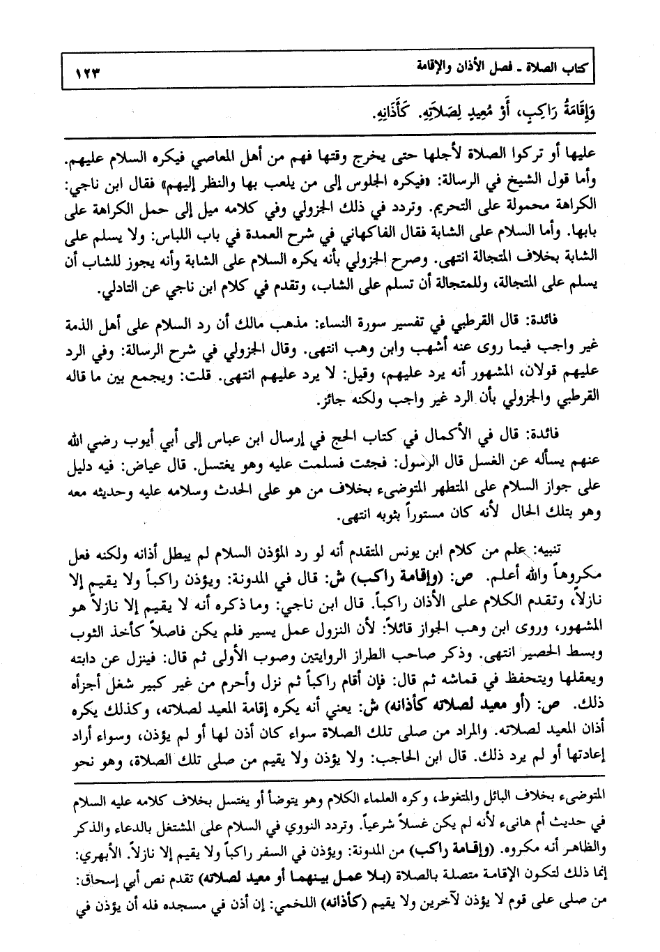 فائدة : قال القرطبي في تفسير سورة النساء مذهب مالك أن رد السلام على أهل الذمة غير واجب فيما روى عنه أشهب وابن وهب انتهى وقال الجزولي في شرح الرسالة وفي الرد عليهم قولان المشهور أنه يرد عليهم وقيل: لا يرد عليهم انتهى قلت: ويجمع بين ما قاله القرطبي والجزولي بأن الرد غير واجب ولكنه جائز.