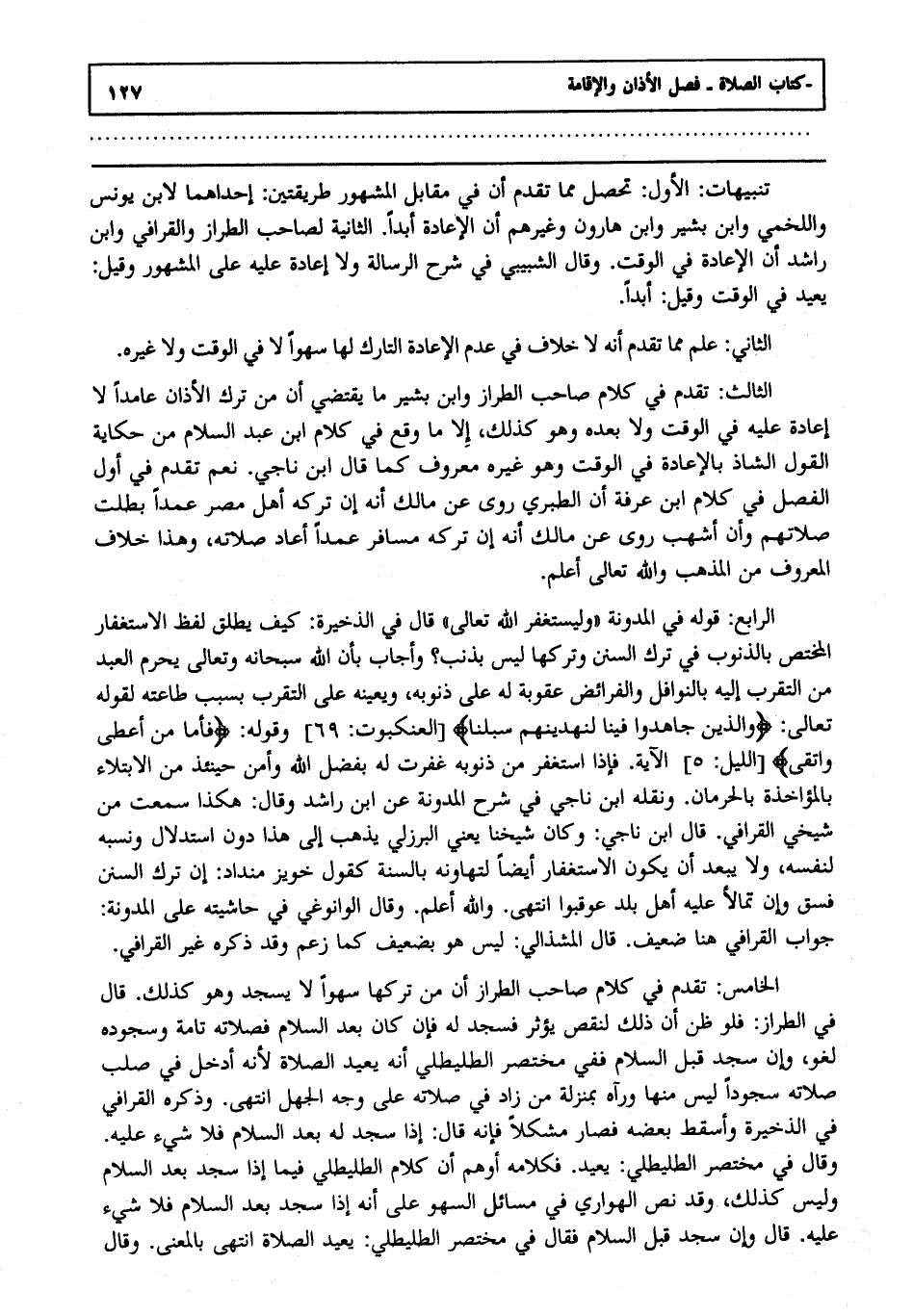 الرابع: قوله: في المدونة وليستغفر الله تعالى قال في الذخيرة كيف يطلق لفظ الاستغفار المختص بالذنوب في ترك السنن وتركها ليس بذنب وأجاب بأن الله سبحانه وتعالى يحرم العبد من التقرب إليه بالنوافل والفرائض عقوبة له على ذنوبه ويعينه على التقرب بسبب طاعته لقوله: تعالى {وَالَّذِينَ جَاهَدُوا فِينَا لَنَهْدِيَنَّهُمْ سُبُلَنَا} (العنكبوت: من الآية69) وقوله: {فَأَمَّا مَنْ أَعْطَى وَاتَّقَى} (الليل:5) الآية فإذا استغفر من ذنوبه غفرت له بفضل الله وأمن حينئذ من الابتلاء بالمؤاخذة بالحرمان ونقله ابن ناجي في شرح المدونة عن ابن راشد وقال هكذا سمعت من شيخي القرافي قال ابن ناجي وكان شيخنا يعني البرزلي يذهب إلى هذا دون استدلال ونسبه لنفسه ولا يبعد أن يكون الاستغفار أيضا لتهاونه بالسنة كقول خويزمنداد إن ترك السنن فسق وإن تمالأ عليه أهل بلد عوقبوا انتهى والله أعلم وقال الوانوغي في حاشيته على المدونة جواب القرافي هنا ضعيف قال المشذالي ليس هو بضعيف كما زعم وقد ذكره غير القرافي الخامس تقدم في كلام صاحب الطراز أن من تركها سهوا لا يسجد وهو كذلك قال في الطراز فلو ظن أن ذلك لنقص يؤثر فسجد له فإن كان بعد السلام فصلاته تامة وسجوده لغو وإن سجد قبل السلام ففي مختصر الطليطلي أنه يعيد الصلاة لأنه أدخل في صلب صلاته سجودا ليس منها ورآه بمنزلة من زاد في صلاته على وجه الجهل انتهى وذكره القرافي في الذخيرة وأسقط بعضه فصار مشكلا فإنه قال إذا سجد له بعد السلام فلا شيء عليه وقال في مختصر الطليطلي يعيد فكلامه أوهم أن كلام الطليطلي فيما إذا سجد بعد السلام وليس كذلك وقد نص الهواري في مسائل السهو على أنه إذا سجد بعد السلام فلا شيء عليه قال وإن سجد قبل السلام فقال في مختصر الطليطلي يعيد الصلاة انتهى بالمعنى وقال