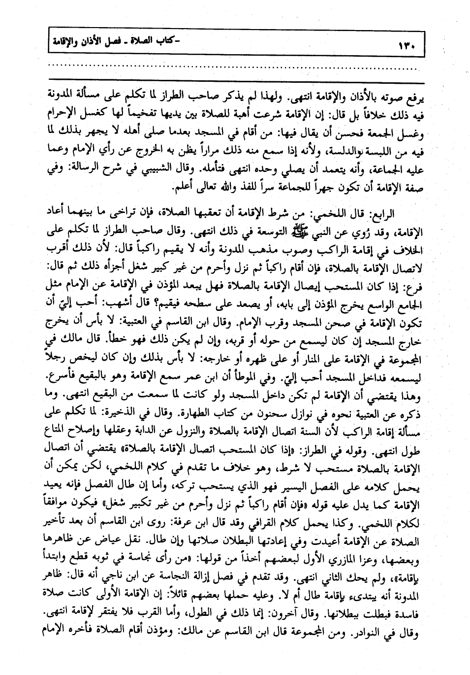 الرابع: قال اللخمي من شرط الإقامة أن تعقبها الصلاة فإن تراخى ما بينهما أعاد الإقامة وقد روي عن النبي صلى الله عليه وسلم التوسعة في ذلك انتهى وقال صاحب الطراز لما تكلم على الخلاف في إقامة الراكب وصوب مذهب المدونة وأنه لا يقيم راكبا قال لأن ذلك أقرب لاتصال الإقامة بالصلاة فإن أقام راكبا ثم نزل وأحرم من غير كبير شغل أجزأه ذلك ثم قال فرع: إذا كان المستحب إيصال الإقامة بالصلاة فهل يبعد المؤذن في الإقامة عن الإمام مثل الجامع الواسع يخرج المؤذن إلى بابه أو يصعد على سطحه فيقيم قال أشهب أحب إلي أن تكون الإقامة في صحن المسجد وقرب الإمام وقال ابن القاسم في العتبية لا بأس أن يخرج خارج المسجد إن كان ليسمع من حوله أو قربه وإن لم يكن ذلك فهو خطأ قال مالك في المجموعة في الإقامة على المنار أو على ظهره أو خارجه لا بأس بذلك وإن كان ليخص رجلا ليسمعه فداخل المسجد أحب إلي وفي الموطأ أن ابن عمر سمع الإقامة وهو بالبقيع فأسرع وهذا يقتضي أن الإقامة لم تكن داخل المسجد ولو كانت لما سمعت من البقيع انتهى وما ذكره عن العتبية نحوه في نوازل سحنون من كتاب الطهارة وقال في الذخيرة لما تكلم على مسألة إقامة الراكب لأن السنة اتصال الإقامة بالصلاة والنزول عن الدابة وعقلها وإصلاح المتاع طول انتهى وقوله: في الطراز إذا كان المستحب اتصال الإقامة بالصلاة يقتضي أن اتصال الإقامة بالصلاة مستحب لا شرط وهو خلاف ما تقدم في كلام اللخمي لكن يمكن أن يحمل كلامه على الفصل: اليسير فهو الذي يستحب تركه وأما إن طال الفصل: فإنه يعيد الإقامة كما يدل عليه قوله: فإن أقام راكبا ثم نزل وأحرم من غير تكبير شغل فيكون موافقا لكلام اللخمي وكذا يحمل كلام القرافي وقد قال ابن عرفة روى ابن القاسم أن بعد تأخير الصلاة عن الإقامة أعيدت وفي إعادتها البطلان صلاتها وإن طال نقل عياض عن ظاهرها وبعضها وعز المازري الأول لبعضهم أخذا من قوله: ا من رأى نجاسة في ثوبه قطع وابتدأ بإقامة ولم يحك الثاني انتهى وقد تقدم في فصل إزالة النجاسة عن ابن ناجي أنه قال ظاهر المدونة أنه يبتدئ بإقامة طال أم لا وعليه حملها بعضهم قائلا إن الإقامة الأولى كانت صلاة فاسدة فبطلت ببطلانها وقال آخرون إنما ذلك في الطول وأما القرب فلا يفتقر لإقامة انتهى وقال في النوادر ومن المجموعة قال ابن القاسم عن مالك ومؤذن أقام الصلاة فأخره الإمام