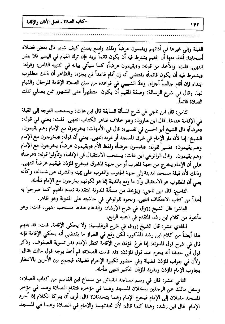 القبلة وإلى غيرها في أذانهم ويقيمون عرضا وذلك واسع يصنع كيف شاء قال بعض فضلاء أصحابنا أخذ منها أن المقيم يشترط فيه أن يكون قائما يريد فإن ترك القيام في اليسير فلا يضر انتهى قلت: والأخذ من قوله: يقيمون عرضا كما سيأتي بيانه في التنبيه: الثامن وقوله: يشترط فيه أن يكون قائما يقتضي أنه إن أقام قاعدا لمن يجزه والظاهر أن ذلك مطلوب ابتداء فإن أقام جالسا أجزاه وعد الشبيبي في قواعده من سنن الصلاة الإقامة للرجال والقيام لها وقال في شرح الرسالة وصفة المقيم أن يكون متطهرا على المشهور ممن يصلي تلك الصلاة قائما.