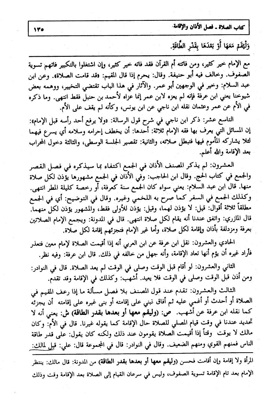 الثالث والعشرون : تقدم عند قول المصنف بلا فصل: مسألة ما إذا رعف المقيم في الصلاة أو أحدث أو أغمي عليه ثم أفاق فبني على إقامته أو بنى غيره على إقامته أن يجزئه كما نقله ابن عرفة عن أشهب ص: وليقم معها أو بعدها بقدر الطاقة ش: يعني أنه لا تحديد عندنا في وقت قيام المصلي للصلاة حال الإقامة كما يقوله: غيرنا قال في الأم وكان مالك لا يوقت وقتا إذا أقيمت الصلاة يقومون عند ذلك ولكنه كان يقول على قدر طاقة الناس فمنهم القوي ومنهم الضعيف وقال في النوادر قال في المجموعة قال علي قيل: لمالك