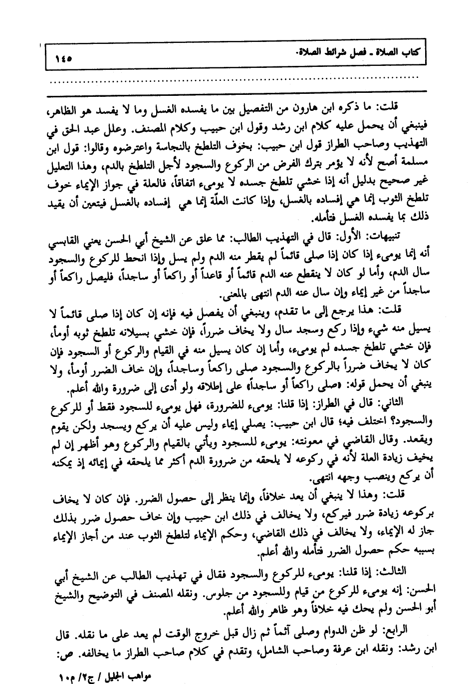 قلت ما ذكره ابن هارون من التفصيل بين ما يفسده الغسل وما لا يفسده هو الظاهر فينبغي أن يحمل عليه كلام ابن رشد وقول ابن حبيب وكلام المصنف وعلل عبد الحق في التهذيب وصاحب الطراز قول ابن حبيب بخوف التلطخ بالنجاسة واعترضوه وقالوا: قول ابن مسلمة أصح لأنه لا يؤمر بترك الفرض من الركوع والسجود لأجل التلطخ بالدم وهذا التعليل غير صحيح بدليل أنه إذا خشي تلطخ جسده لا يومئ اتفاقا فالعلة في جواز الإيماء خوف تلطخ الثوب إنما هي إفساد بالغسل وإذا كانت العلة إنما هي إفساده بالغسل فيتعين أن يقيد ذلك بما يفسده الغسل فتأمله.