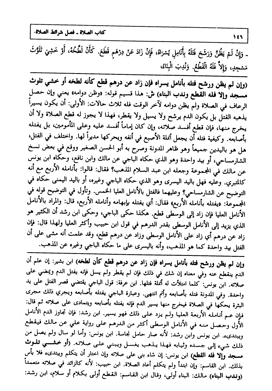 "وإن لم يظن ورشح فتله بأنامل يسراه فإن زاد عن درهم قطع كأن لطخه أو خشي تلوث مسجد وإلا فله القطع وندب البناء" ش: هذا قسيم قوله وظن دوامه يعني وإن حصل الرعاف في الصلاة ولم يظن دوامه لآخر الوقت فله ثلاث حالات الأولى أن يكون يسيرا يذهبه الفتل بل يكون الدم يرشح ولا يسيل ولا يقطر فهذا لا يجوز له قطع الصلاة ولا أن يخرج منها فإن قطع أفسد صلاته وإن كان إماما أفسد عليه وعلى المأمومين بل يفتله بأصابعه وكيفية فتله أن يجعل أنملة الإصبع في أنفه ويحركها مديرا لها واختلف في الفتل هل هو باليدين جميعا وهو ظاهر المدونة وصرح به أبو الحسن الصغير ووقع في بعض نسخ الشارمساحي أو بيد واحدة وهو الذي حكاه الباجي عن مالك وابن نافع وحكاه ابن يونس عن مالك في المجموعة وجعله ابن عبد السلام المذهب فقال: قالوا بأنامله الأربع مع أنه كالمتبري وعليه فهل باليد اليسرى وهو الذي حكاه الباجي وغيره أو باليد اليمنى حكاه في التوضيح عن الشارمساحي وعليهما فالفتل بالأنامل العليا الخمس وتأول في التوضيح قوله في المجموعة يفتله بأنامله الأربع فقال: أي يفتله بإبهامه وأنامله الأربع قال: والمراد بالأنامل الأنامل العليا فإن زاد إلى الوسطى قطع هكذا حكى الباجي وحكى ابن رشد أن الكثير هو الذي يزيد إلى الأنامل الوسطى بقدر الدرهم في قول ابن حبيب وأكثر العليا ولهذا قال: فإن زاد عن درهم أي فإن زاد على الأنامل الوسطى وزاد عن درهم قطع وقد علمت أنه مشى على أن الفتل بيد واحدة كما هو المذهب وأنه باليسرى وعلى ما حكاه الباجي وغيره عن المذهب.