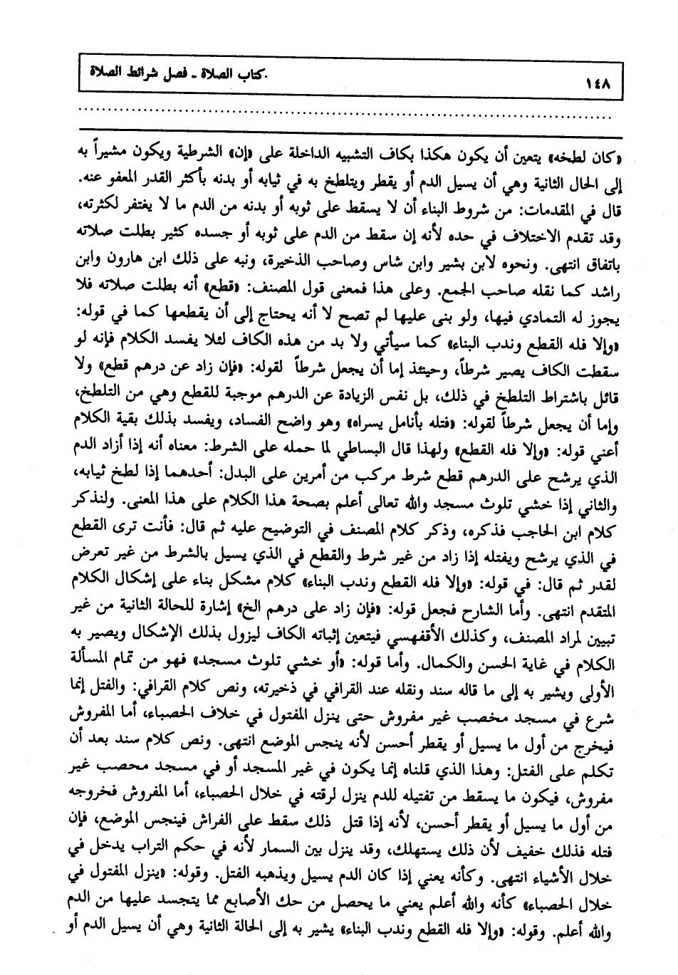 كان لطخه يتعين أن يكون هكذا بكاف التشبيه الداخلة على أن الشرطية ويكون مشيرا به إلى الحال الثانية وهي أن يسيل الدم أو يقطر ويتلطخ به في ثيابه أو بدنه بأكثر القدر المعفو عنه قال في المقدمات من شروط البناء أن لا يسقط على ثوبه أو بدنه من الدم ما لا يغتفر لكثرته وقد تقدم الاختلاف في حده لأنه إن سقط من الدم على ثوبه أو جسده كثير بطلت صلاته باتفاق انتهى. ونحوه لابن بشير وابن شاس وصاحب الذخيرة ونبه على ذلك ابن هارون وابن راشد كما نقله صاحب الجمع وعلى هذا فمعنى قول المصنف قطع أنه بطلت صلاته فلا يجوز له التمادي فيها ولو بنى عليها لم تصح لا أنه يحتاج إلى أن يقطعها كما في قوله وإلا فله القطع وندب البناء كما سيأتي ولا بد من هذه الكاف لئلا يفسد الكلام فإنه لو سقطت الكاف يصير شرطا وحينئذ إما أن يجعل شرطا لقوله فإن زاد عن درهم قطع ولا قائل باشتراط التلطخ في ذلك بل نفس الزيادة عن الدرهم موجبة للقطع وهي من التلطخ وإما أن يجعل شرطا لقوله فتله بأنامل يسراه وهو واضح الفساد ويفسد بذلك بقية الكلام أعني قوله وإلا فله القطع ولهذا قال البساطي لما حمله على الشرط معناه أنه إذا أزاد الدم الذي يرشح على الدرهم قطع شرط مركب من أمرين على البدل أحدهما إذا لطخ ثيابه والثاني إذا خشي تلوث مسجد والله - تعالى - أعلم بصحة هذا الكلام وعلى هذا المعنى ولنذكر كلام ابن الحاجب فذكره وذكر كلام المصنف في التوضيح عليه ثم قال: فأنت ترى القطع في الذي يرشح ويفتله إذا زاد من غير شرط والقطع في الذي يسيل بالشرط من غير تعرض لقدر ثم قال في قوله وإلا فله القطع وندب البناء كلام مشكل بناء على إشكال الكلام المتقدم انتهى وأما الشارح فجعل قوله فإن زاد على درهم إلخ إشارة للحالة الثانية من غير تبيين لمراد المصنف وكذلك الأقفهسي فيتعين إثبات الكاف ليزول بذلك الإشكال ويصير به الكلام في غاية الحسن والكمال وأما قوله أو خشي تلوث مسجد فهو من تمام المسألة الأولى ويشير به إلى ما قاله سند ونقله عنه القرافي في ذخيرته ونص كلام القرافي: والفتل إنما شرع في مسجد محصب غير مفروش حتى ينزل المفتول في خلال الحصباء أما المفروش فيخرج من أول ما يسيل أو يقطر أحسن لأنه ينجس الموضع انتهى, ونص كلام سند بعد أن تكلم على الفتل وهذا الذي قلناه إنما يكون في غير المسجد أو في مسجد محصب غير مفروش فيكون ما يسقط من تفتيله للدم ينزل لرقته في خلال الحصباء أما المفروش فخروجه من أول ما يسيل أو يقطر أحسن لأنه إذا فتل ذلك سقط على الفراش فينجس الموضع فإن فتله فذلك خفيف لأن ذلك يستهلك وقد ينزل بين السماد لأنه في حكم التراب يدخل في خلال الأشياء انتهى وكأنه يعني إذا كان الدم يسيل ويذهبه الفتل وقوله ينزل المفتول في خلال الحصباء كأنه والله أعلم يعني ما يحصل من حك الأصابع مما يتجسد عليها من الدم والله أعلم. وقوله وإلا فله القطع وندب البناء يشير به إلى الحالة الثانية وهي أن يسيل الدم أو