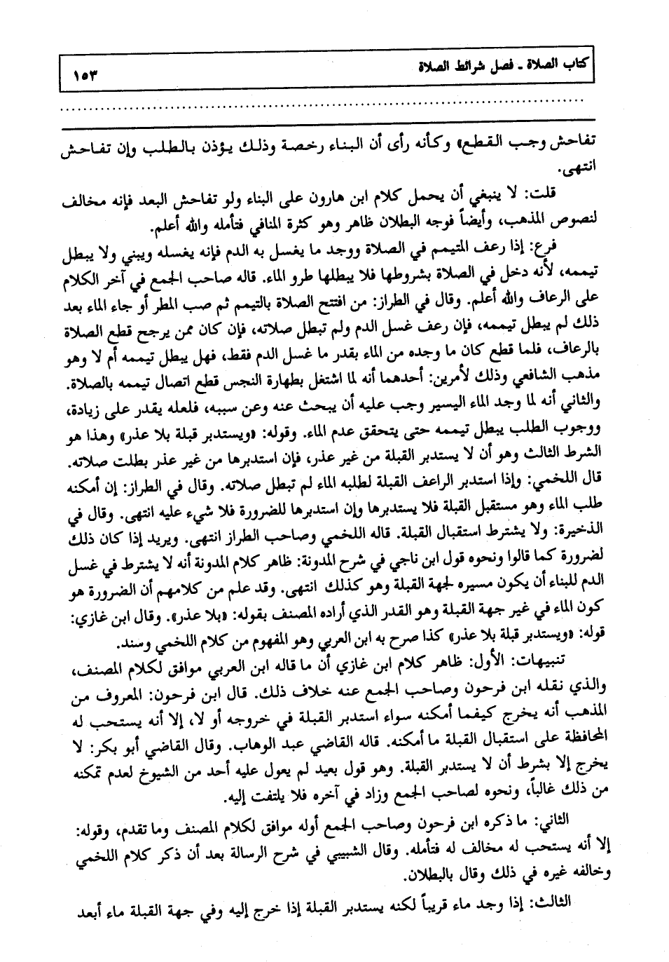 تنبيهات: الأول: ظاهر كلام ابن غازي أن ما قاله ابن العربي موافق لكلام المصنف والذي نقله ابن فرحون وصاحب الجمع عنه خلاف ذلك قال ابن فرحون المعروف من المذهب أنه يخرج كيفما أمكنه سواء استدبر القبلة في خروجه أو لا إلا أنه يستحب له المحافظة على استقبال القبلة ما أمكنه قاله القاضي عبد الوهاب وقال القاضي أبو بكر لا يخرج إلا بشرط أن لا يستدبر القبلة وهو قول بعيد لم يعول عليه أحد من الشيوخ لعدم تمكنه من ذلك غالبا ونحوه لصاحب الجمع وزاد في آخره فلا يلتفت إليه.