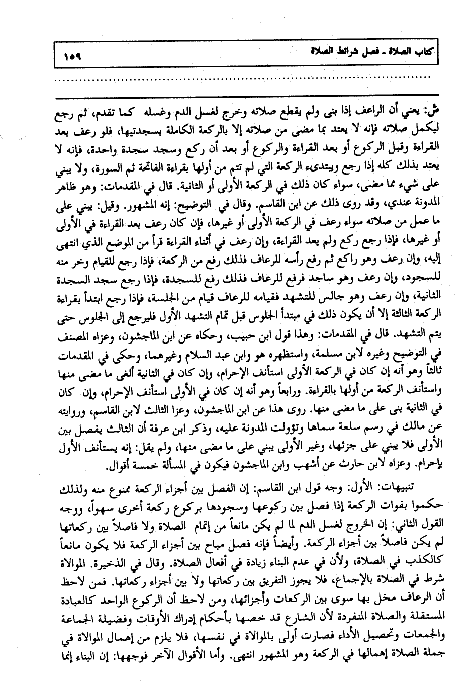 تنبيهات: الأول: وجه قول ابن القاسم إن الفصل بين أجزاء الركعة ممنوع منه ولذلك حكموا بفوات الركعة إذا فصل بين ركوعها وسجودها بركوع ركعة أخرى سهوا ووجه القول الثاني أن الخروج لغسل الدم لما لم يكن مانعا من إتمام الصلاة ولا فاصلا بين ركعاتها لم يكن فاصلا بين أجزاء الركعة وأيضا فإنه فصل مباح بين أجزاء الركعة فلا يكون مانعا كالكذب في الصلاة ولأن في عدم البناء زيادة في أفعال الصلاة وقال في الذخيرة الموالاة شرط في الصلاة بالإجماع فلا يجوز التفريق بين ركعاتها ولا بين أجزاء ركعاتها فمن لاحظ أن الرعاف مخل بها سوى بين الركعات وأجزائها ومن لاحظ أن الركوع الواحد كالعبادة المستقلة والصلاة المنفردة لأن الشارع قد خصها بأحكام إدراك الأوقات وفضيلة الجماعة والجمعات وتحصيل الأداء فصارت أولى بالموالاة في نفسها فلا يلزم من إهمال الموالاة في جملة الصلاة إهمالها في الركعة وهو المشهور انتهى. وأما الأقوال الأخر فوجهها أن البناء إنما