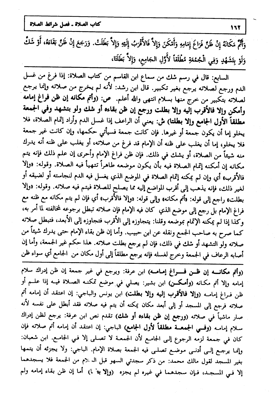 السابع : قال في رسم شك من سماع ابن القاسم من كتاب الصلاة إذا فرغ من غسل الدم ورجع لصلاته يرجع بغير تكبير قال ابن رشد لأنه لم يخرج من صلاته وإنما يرجع لصلاته بتكبير من خرج منها بسلام انتهى والله أعلم.