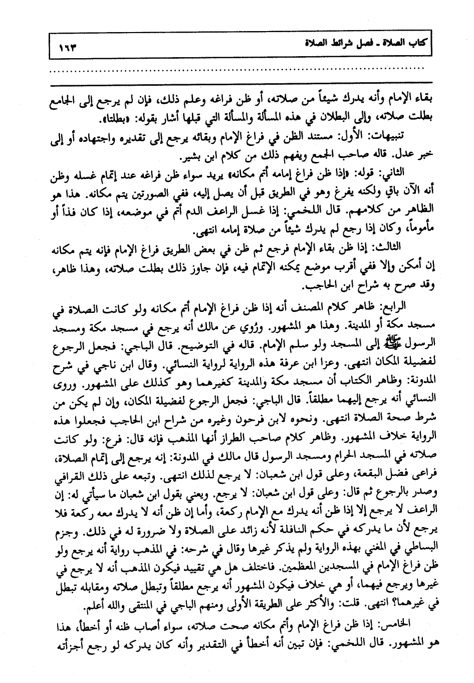 الخامس : إذا ظن فراغ الإمام وأتم مكانه صحت صلاته سواء أصاب ظنه أو أخطأ هذا هو المشهور قال اللخمي فإن تبين أنه أخطأ في التقدير وأنه كان يدركه لو رجع أجزأته