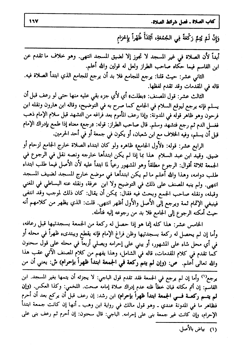 الرابع عشر: قوله لأول الجامع ظاهره ولو كان ابتداء الصلاة خارج الجامع لزحام أو ضيق, وقيد ابن عبد السلام هذا بما إذا لم يكن ابتدأها خارجه ونصه - نقل في الرجوع في الجمعة ثلاثة أقوال: الرجوع مطلقا وهو المشهور رعيا لما ابتدأ عليه لأن الأصل فيما طلب ابتداء طلب دوامه. وهذا والله أعلم ما لم يكن ابتدأها في موضع خارج المسجد لضيق المسجد انتهى. ولم ينبه المصنف على ذلك في التوضيح ولا ابن عرفة ونقله عنه البساطي في المغني وقبله ونقله صاحب الجمع وبحث فيه فقال: يمكن أن يقال كان ذلك لموجب وقد انتفى فينبغي الإتمام ثمة ويرجع إلى الأصل والأول أظهر انتهى. قلت: الذي يظهر من كلامهم أنه حيث أمكنه الرجوع إلى الجامع فلا بد من رجوعه إليه فتأمله.
