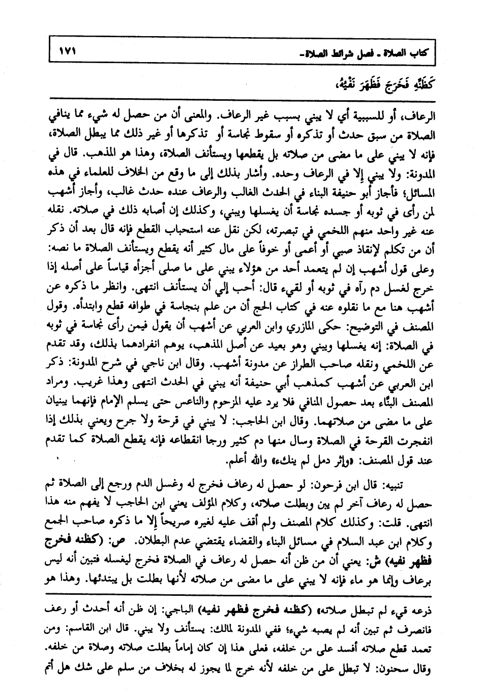 تنبيه : قال ابن فرحون: لو حصل له رعاف فخرج له وغسل الدم ورجع إلى الصلاة ثم حصل له رعاف آخر لم يبن وبطلت صلاته, وكلام المؤلف يعني ابن الحاجب لا يفهم منه هذا انتهى قلت: وكذلك كلام المصنف ولم أقف عليه لغيره صريحا إلا ما ذكره صاحب الجمع, وكلام ابن عبد السلام في مسائل البناء والقضاء يقتضي عدم البطلان.
