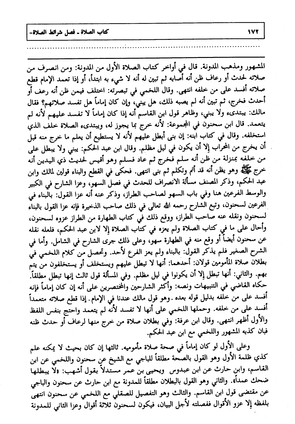 وعلى الأول لو كان إماما في صحة صلاة مأموميه, ثالثها إن كان بحيث لا يمكنه علم كذي ظلمة الأول وهو القول بالصحة مطلقا للباجي مع الشيخ عن سحنون واللخمي عن ابن القاسم وابن حارث عن ابن عبدوس ويحيى بن عمر مستدلا بقول أشهب لا يبطلها ضحك عمدا والثاني وهو القول بالبطلان مطلقا للمدونة مع ابن حارث عن سحنون والباجي عن مقتضى قول ابن القاسم والثالث وهو التفصيل للصقلي مع اللخمي عن سحنون انتهى بلفظه إلا عزو الأقوال ففصلته لأجل البيان فيكون لسحنون ثلاثة أقوال وعزا الثاني للمدونة