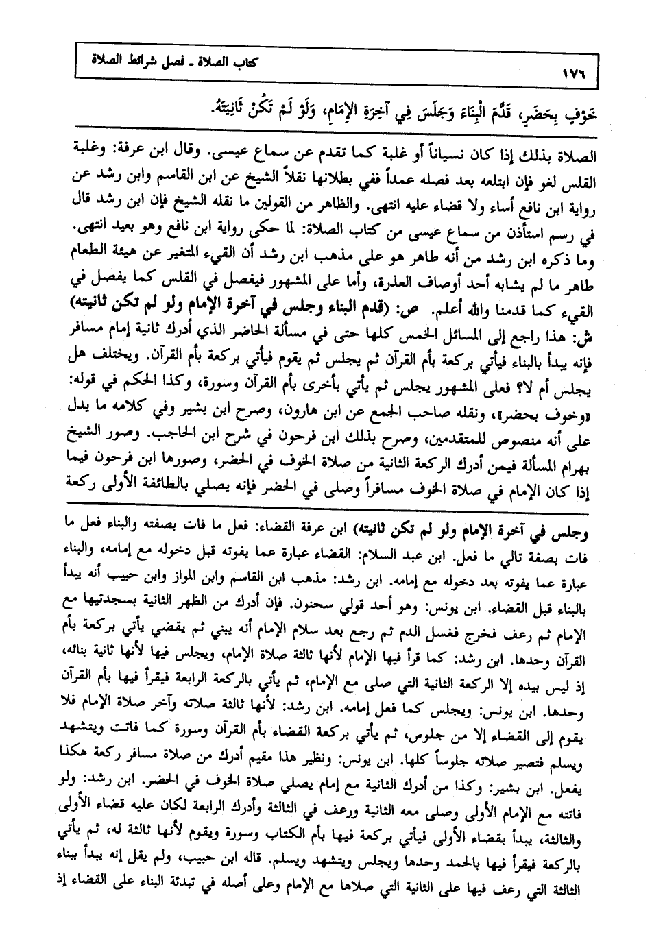 ص:"قدم البناء وجلس في آخرة الإمام ولو لم تكن ثانيته" ش: هذا راجع إلى المسائل الخمس كلها حتى في مسألة الحاضر الذي أدرك ثانية إمام مسافر فإنه يبدأ بالبناء فيأتي بركعة بأم القرآن ثم يجلس ثم يقوم فيأتي بركعة بأم القرآن ويختلف هل يجلس أم لا فعلى المشهور يجلس ثم يأتي بأخرى بأم القرآن وسورة وكذا الحكم في قوله وخوف بحضر ونقله صاحب الجمع عن ابن هارون وصرح ابن بشير وفي كلامه ما يدل على أنه منصوص للمتقدمين, وصرح بذلك ابن فرحون في شرح ابن الحاجب وصور الشيخ بهرام المسألة فيمن أدرك الركعة الثانية من صلاة الخوف في الحضر, وصورها ابن فرحون فيما إذا كان الإمام في صلاة الخوف مسافرا وصلى في الحضر فإنه يصلي بالطائفة الأولى ركعة
