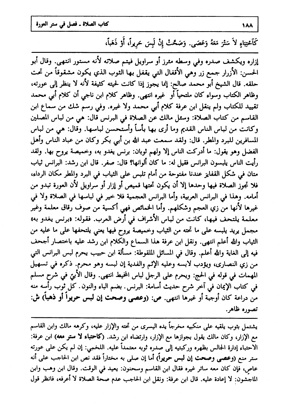 إزاره ويكشف صدره وفي وسطه مئزر أو سراويل فيتم صلاته لأنه مستور انتهى. وقال أبو الحسن: "الأزرار" جمع زر وهي الأقفال التي يقفل بها الثوب الذي يكون مشقوقا من تحت حلقه قال الشيخ أبو محمد صالح: إنما يجوز إذا كانت لحيته كثيفة لأنه لا ينظر إلى عورته, وظاهر الكتاب وسواء كان ملتحيا أو غيره انتهى, وظاهر كلام ابن ناجي أن كلام أبي محمد تقييد للكتاب ولم ينقل ابن عرفة كلام أبي محمد ولا غيره, وفي رسم شك من سماع ابن القاسم من كتاب الصلاة وسئل مالك عن الصلاة في البرنس قال: هي من لباس المصلين وكانت من لباس الناس القديم وما أرى بها بأسا وأستحسن لباسها, وقال: هي من لباس المسافرين للبرد والمطر, قال: ولقد سمعت عبد الله بن أبي بكر وكان من عباد الناس وأهل الفضل وهو يقول: ما أدركت الناس إلا ولهم ثوبان برنس يغدو به وخميصة يروح بها, ولقد رأيت الناس يلبسون البرانس فقيل له: ما كان ألوانها, قال: صفر قال ابن رشد: "البرانس": ثياب متان في شكل القفايز عندنا مفتوحة من أمام, تلبس على الثياب في البرد والمطر مكان الرداء فلا تجوز الصلاة فيها وحدها إلا أن يكون تحتها قميص أو إزار أو سراويل ; لأن العورة تبدو من أمامه وهذا في البرانس العربية وأما البرانس العجمية فلا خير في لباسها في الصلاة ولا في غيرها لأنها من زي العجم وشكلهم, وأما الخمائص فهي أكسية من صوف رقاق معلمة وغير معلمة يلتحف فيها كانت من لباس الإشراف في أرض العرب, فقوله برنس يغدو به مجمل يريد يلبسه على ما تحته من الثياب وخميصة يروح فيها يعني يلتحفها على ما عليه من الثياب - والله أعلم - انتهى. ونقل ابن عرفة هذا السماع وكلام ابن رشد عليه باختصار أجحف فيه إلى الغاية والله أعلم. وقال في المسائل الملقوطة مسألة ابن حبيب: يحرم لبس البرانس التي من زي النصارى ويؤدب لابسه وعليه الإثم والفدية إن لبسه وهو محرم ذكره في تسهيل المهمات في قوله في الحج ويحرم على الرجل لباس المخيط انتهى. وقال الأبي في شرح مسلم في كتاب الإيمان في آخر شرح حديث أسامة: "البرنس" بضم الباء والنون كل ثوب رأسه منه من دراعة كان أو جبة أو غيرها انتهى.