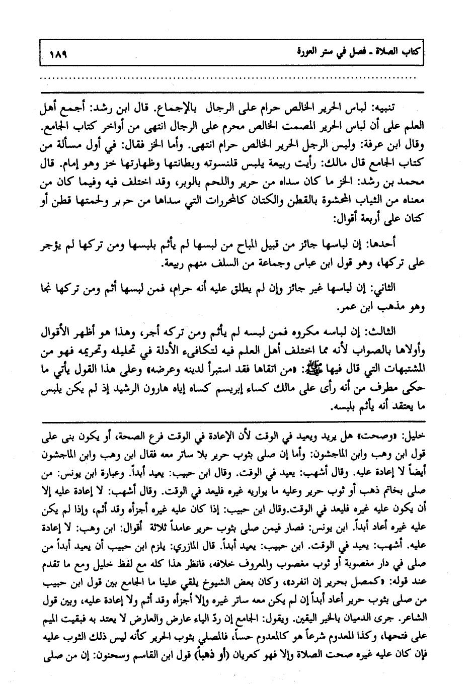 تنبيه : لباس الحرير الخالص حرام على الرجال بالإجماع قال ابن رشد: أجمع أهل العلم على أن لباس الحرير المصمت الخالص محرم على الرجال انتهى من أواخر كتاب الجامع وقال ابن عرفة: ولبس الرجل الحرير الخالص حرام انتهى وأما الخز فقال في أول مسألة من كتاب الجامع: قال مالك رأيت ربيعة يلبس قلنسوته وبطانتها وظهارتها خز وهو إمام قال محمد بن رشد الخز ما كان سداه من حرير, واللحم بالوبر وقد اختلف فيه وفيما كان من معناه من الثياب المحشوة بالقطن والكتان كالمحررات التي سداها من حرير ولحمتها قطن أو كتان على أربعة أقوال: