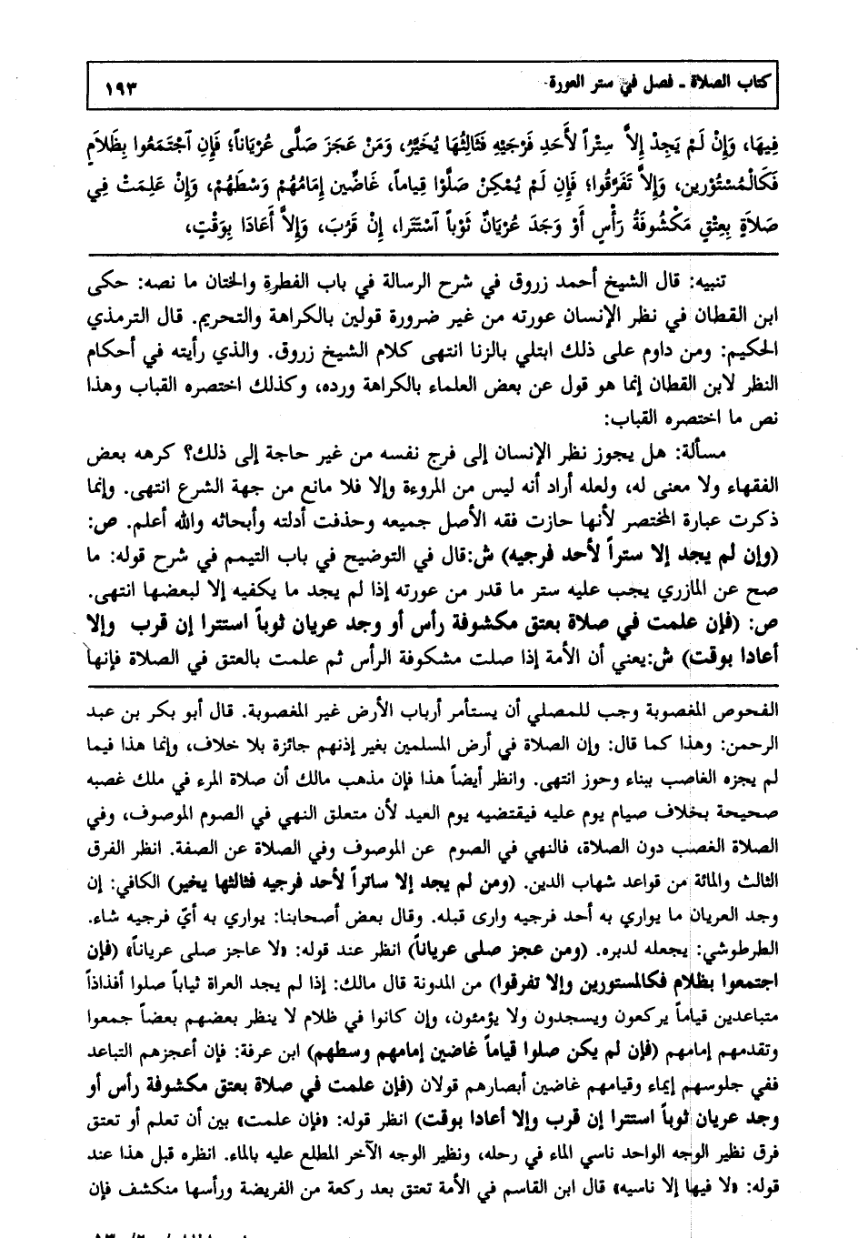 تنبيه : قال الشيخ أحمد زروق في شرح الرسالة في باب الفطرة والختان ما نصه: حكى ابن القطان في نظر الإنسان عورته من غير ضرورة قولين بالكراهة والتحريم, قال الترمذي الحكيم: ومن داوم على ذلك ابتلي بالزنا انتهى كلام الشيخ زروق. والذي رأيته في أحكام النظر لابن القطان إنما هو قول عن بعض العلماء بالكراهة ورده وكذلك اختصره القباب وهذا نص ما اختصره القباب.