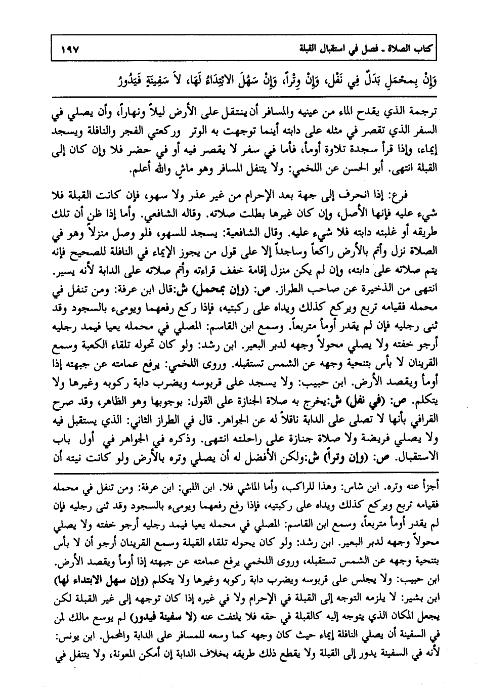 ترجمة الذي يقدح الماء من عينيه: وللمسافر أن يتنفل على الأرض ليلا ونهارا وأن يصلي في السفر الذي تقصر في مثله على دابته أينما توجهت به الوتر وركعتي الفجر والنافلة ويسجد إيماء وإذا قرأ سجدة تلاوة أومأ فأما في سفر لا يقصر فيه أو في حضر فلا وإن كان إلى القبلة انتهى. أبو الحسن عن اللخمي ولا يتنفل المسافر وهو ماش والله أعلم. فرع: إذا انحرف إلى جهة بعد الإحرام من غير عذر ولا سهو فإن كانت القبلة فلا شيء عليه فإنها الأصل وإن كان غيرها بطلت صلاته وقاله الشافعي وأما إذا ظن أن تلك طريقه أو غلبته دابته فلا شيء عليه وقال الشافعية: يسجد للسهو فلو وصل منزلا وهو في الصلاة نزل وأتم بالأرض راكعا وساجدا إلا على قول من يجوز الإيماء في النافلة للصحيح فإنه يتم صلاته على دابته وإن لم يكن منزل إقامة خفف قراءته وأتم صلاته على الدابة لأنه يسير انتهى من الذخيرة عن صاحب الطراز.