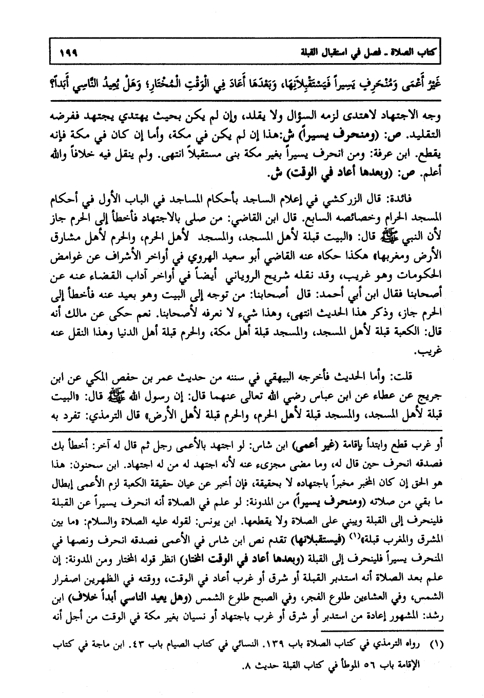 فائدة : قال الزركشي في إعلام الساجد بأحكام المساجد في الباب الأول في أحكام المسجد الحرام وخصائصه السابع قال ابن القاضي: من صلى بالاجتهاد فأخطأ إلى الحرم جاز "لأن النبي صلى الله عليه وسلم قال: "البيت قبلة لأهل المسجد والمسجد لأهل الحرم والحرم لأهل مشارق الأرض ومغاربها" هكذا حكاه عنه القاضي أبو سعيد الهروي في أواخر الإشراف عن غوامض الحكومات وهو غريب وقد نقله شريح الروياني أيضا في أواخر آداب القضاء عنه عن أصحابنا فقال ابن أبي أحمد: قال أصحابنا: من توجه إلى البيت وهو بعيد عنه فأخطأ إلى الحرام جاز وذكر هذا الحديث انتهى. وهذا شيء لا نعرفه لأصحابنا. نعم حكي عن مالك أنه قال: الكعبة قبلة لأهل المسجد والمسجد قبلة أهل مكة والحرم قبلة أهل الدنيا وهذا النقل عنه غريب.