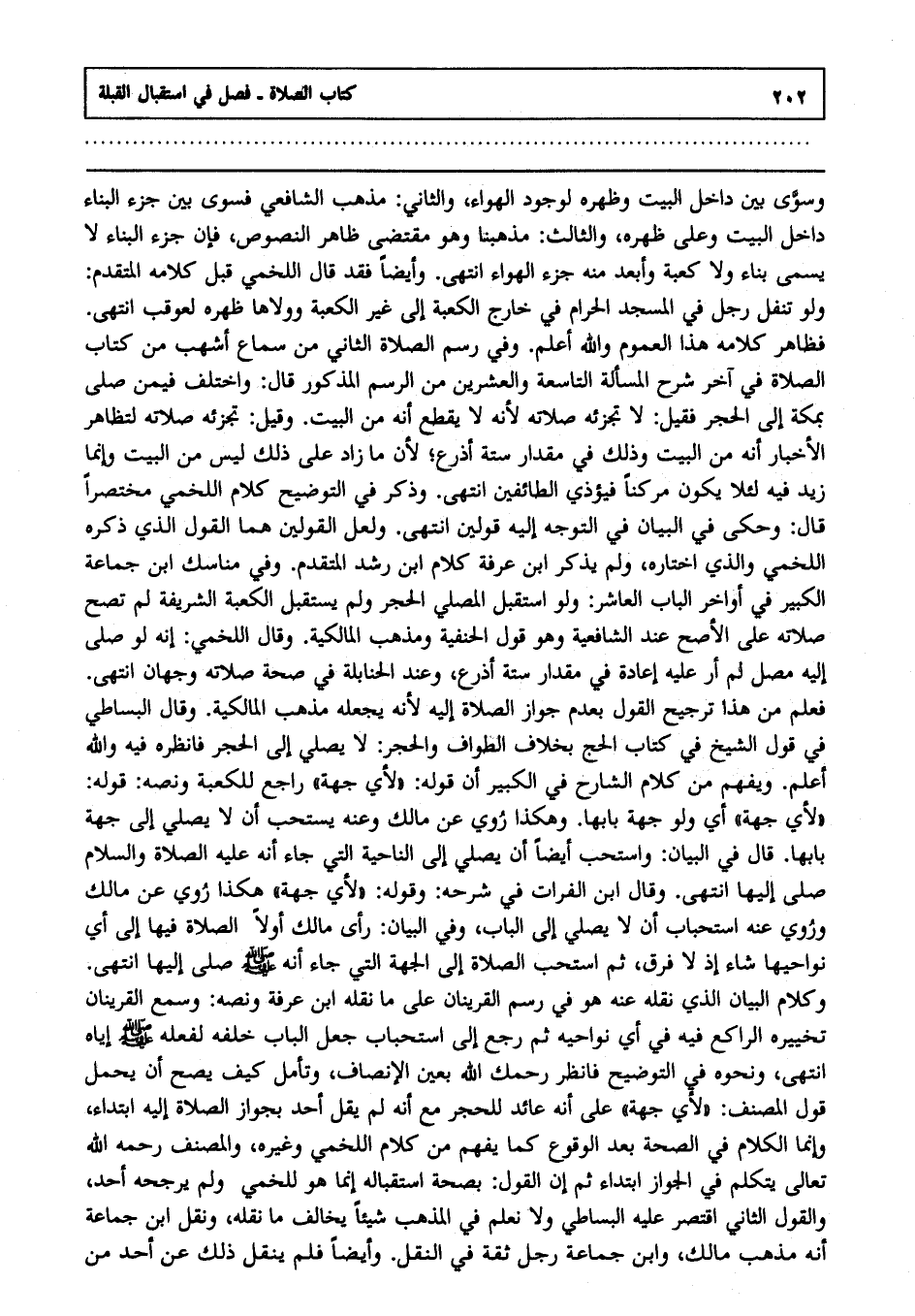 وسوَّى بين داخل البيت وظهره لوجود الهواء, والثاني مذهب الشافعي فسوى بين جزء البناء داخل البيت. وعلى ظهره, والثالث مذهبنا وهو مقتضى ظاهر النصوص, فإن جزء البناء لا يسمى بناء ولا كعبة وأبعد منه جزء الهواء انتهى. وأيضا فقد قال اللخمي قبل كلامه المتقدم: ولو تنفل رجل في المسجد الحرام في خارج الكعبة إلى غير الكعبة وولاها ظهره لعوقب انتهى, فظاهر كلامه هذا العموم والله أعلم, وفي رسم الصلاة الثاني من سماع أشهب من كتاب الصلاة في آخر شرح المسألة التاسعة والعشرين من الرسم المذكور, قال: واختلف فيمن صلى بمكة إلى الحجر فقيل: لا تجزئه صلاته ; لأنه لا يقطع أنه من البيت وقيل تجزئه صلاته لتظاهر الأخبار أنه من البيت وذلك في مقدار ستة أذرع لأن ما زاد على ذلك ليس من البيت وإنما زيد فيه لئلا يكون مركنا فيؤذي الطائفين انتهى, وذكر في التوضيح كلام اللخمي مختصرا قال: وحكى في البيان في التوجه إليه قولين انتهى. ولعل القولين هما القول الذي ذكره اللخمي والذي اختاره ولم يذكر ابن عرفة كلام ابن رشد المتقدم وفي مناسك ابن جماعة الكبير في أواخر الباب العاشر ولو استقبل المصلي الحجر ولم يستقبل الكعبة الشريفة لم تصح صلاته على الأصح عند الشافعية وهو قول الحنفية ومذهب المالكية وقال اللخمي: إنه لو صلى إليه مصل لم أر عليه إعادة في مقدار ستة أذرع وعند الحنابلة في صحة صلاته وجهان انتهى. فعلم من هذا ترجيح القول بعدم جواز الصلاة إليه لأنه جعله مذهب المالكية وقال البساطي في قول الشيخ في كتاب الحج: بخلاف الطواف والحجر لا يصلى إلى الحجر فانظره فيه والله أعلم. ويفهم من كلام الشارح في الكبير أن قوله لأي جهة راجع للكعبة ونصه قوله لأي جهة أي ولو جهة بابها وهكذا روي عن مالك وعنه يستحب أن لا يصلي إلى جهة بابها, قال في البيان: واستحب أيضا أن يصلي إلى الناحية التي جاء أنه عليه الصلاة والسلام صلى إليها انتهى. وقال ابن الفرات في شرحه وقوله لأي جهة هكذا روي عن مالك وروي عنه استحباب أن لا يصلي إلى الباب وفي البيان رأى مالك أولا الصلاة فيها إلى أي نواحيها شاء إذ لا فرق ثم استحب الصلاة إلى الجهة التي جاء أنه صلى الله عليه وسلم صلى إليها انتهى. وكلام البيان الذي نقله عنه هو في رسم القرينان على ما نقله ابن عرفة ونصه وسمع القرينان تخييره الراكع فيه في أي نواحيه ثم رجع إلى استحباب جعل الباب خلفه لفعله صلى الله عليه وسلم إياه انتهى. ونحوه في التوضيح فانظر - رحمك الله - بعين الإنصاف وتأمل كيف يصح أن يحمل قول المصنف لأي جهة على أنه عائد للحجر مع أنه لم يقل أحد بجواز الصلاة إليه ابتداء وإنما الكلام في الصحة بعد الوقوع كما يفهم من كلام اللخمي وغيره والمصنف - رحمه الله تعالى - يتكلم في الجواز ابتداء ثم إن القول بصحة استقباله إنما هو للخمي ولم يرجحه أحد والقول الثاني اقتصر عليه البساطي ولا نعلم في المذهب شيئا يخالف ما نقله, ونقل ابن جماعة أنه مذهب مالك وابن جماعة رجل ثقة في النقل وأيضا فلم ينقل ذلك عن أحد من