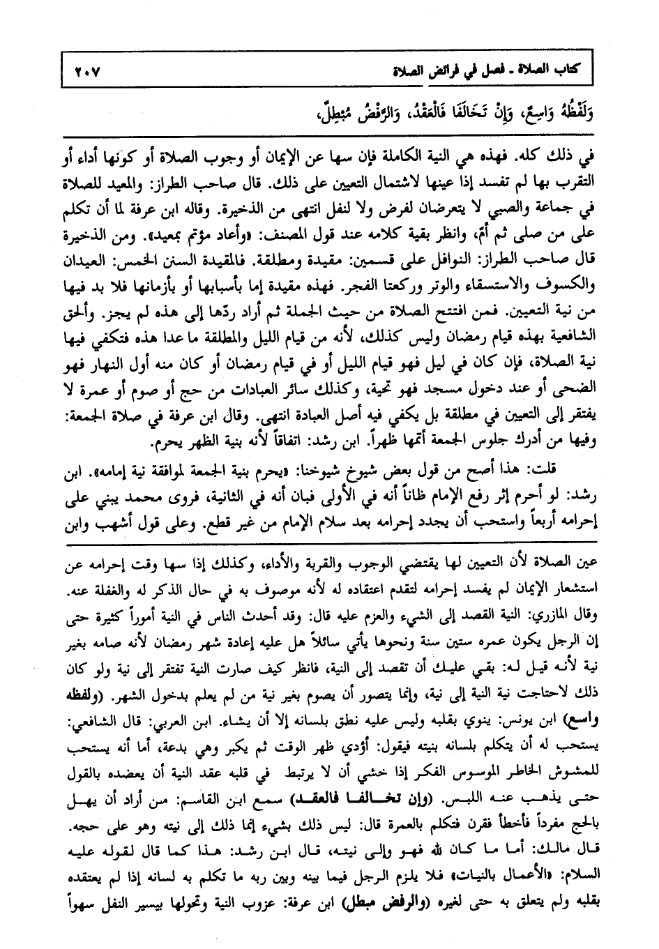 في ذلك كله, فهذه هي النية الكاملة فإن سها عن الإيمان أو وجوب الصلاة أو كونها أداء أو التقرب بها لم تفسد إذا عينها;لاشتمال التعيين على ذلك قال صاحب الطراز: والمعيد للصلاة في جماعة والصبي لا يتعرضان لفرض ولا لنفل, انتهى من الذخيرة وقاله ابن عرفة: لما أن تكلم على من صلى ثم أم وانظر بقية كلامه عند قول المصنف وأعاد مؤتم بمعيد ومن الذخيرة قال صاحب الطراز: النوافل على قسمين مقيدة ومطلقة فالمقيدة السنن الخمس: العيدان والكسوف والاستسقاء والوتر وركعتا الفجر, فهذه مقيدة إما بأسبابها أو بأزمانها فلا بد فيها من نية التعيين, فمن افتتح الصلاة من حيث الجملة ثم أراد ردها إلى هذه لم يجز وألحق الشافعية بهذه قيام رمضان وليس كذلك ; لأنه من قيام الليل, والمطلقة ما عدا هذه فتكفي فيها نية الصلاة فإن كان في ليل فهو قيام الليل أو في قيام رمضان أو كان منه أول النهار فهو الضحى أو عند دخول مسجد فهو تحية وكذلك سائر العبادات من حج أو صوم أو عمرة لا يفتقر إلى التعيين في مطلقة بل يكفي فيه أصل العبادة انتهى وقال ابن عرفة في صلاة الجمعة: وفيها من أدرك جلوس الجمعة أتمها ظهرا, ابن رشد اتفاقا ; لأنه بنية الظهر يحرم.