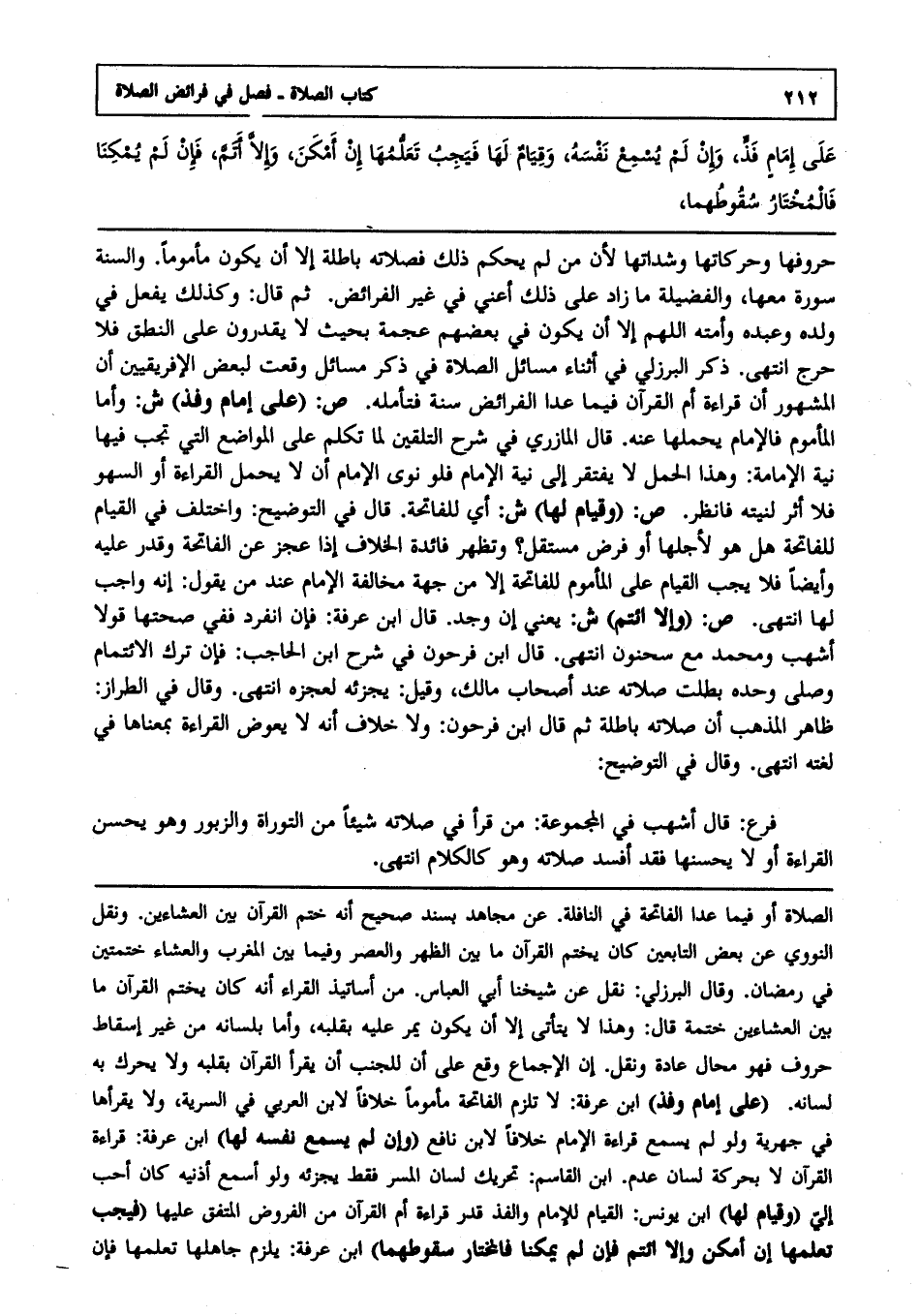 حروفها وحركاتها وشداتها ; لأن من لم يحكم ذلك فصلاته باطلة إلا أن يكون مأموما, والسنة سورة معها والفضيلة ما زاد على ذلك, أعني في غير الفرائض, ثم قال: وكذلك يفعل في ولده وعبده وأمته اللهم إلا أن يكون في بعضهم عجمة بحيث لا يقدرون على النطق فلا حرج, انتهى. ذكر البرزلي في أثناء مسائل الصلاة في ذكر مسائل وقعت لبعض الأفريقيين أن المشهور أن قراءة أم القرآن فيما عدا الفرائض سنة فتأمله.