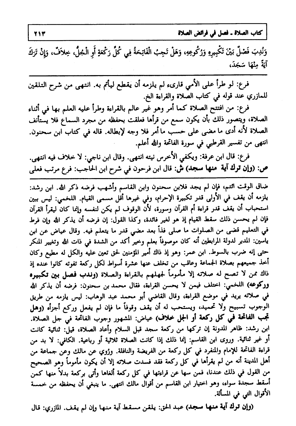 وندب فصل بين تكبيره وركوعه وهل تجب الفاتحة في كل ركعة أو الجل خلاف وإن ترك آية منها سجد