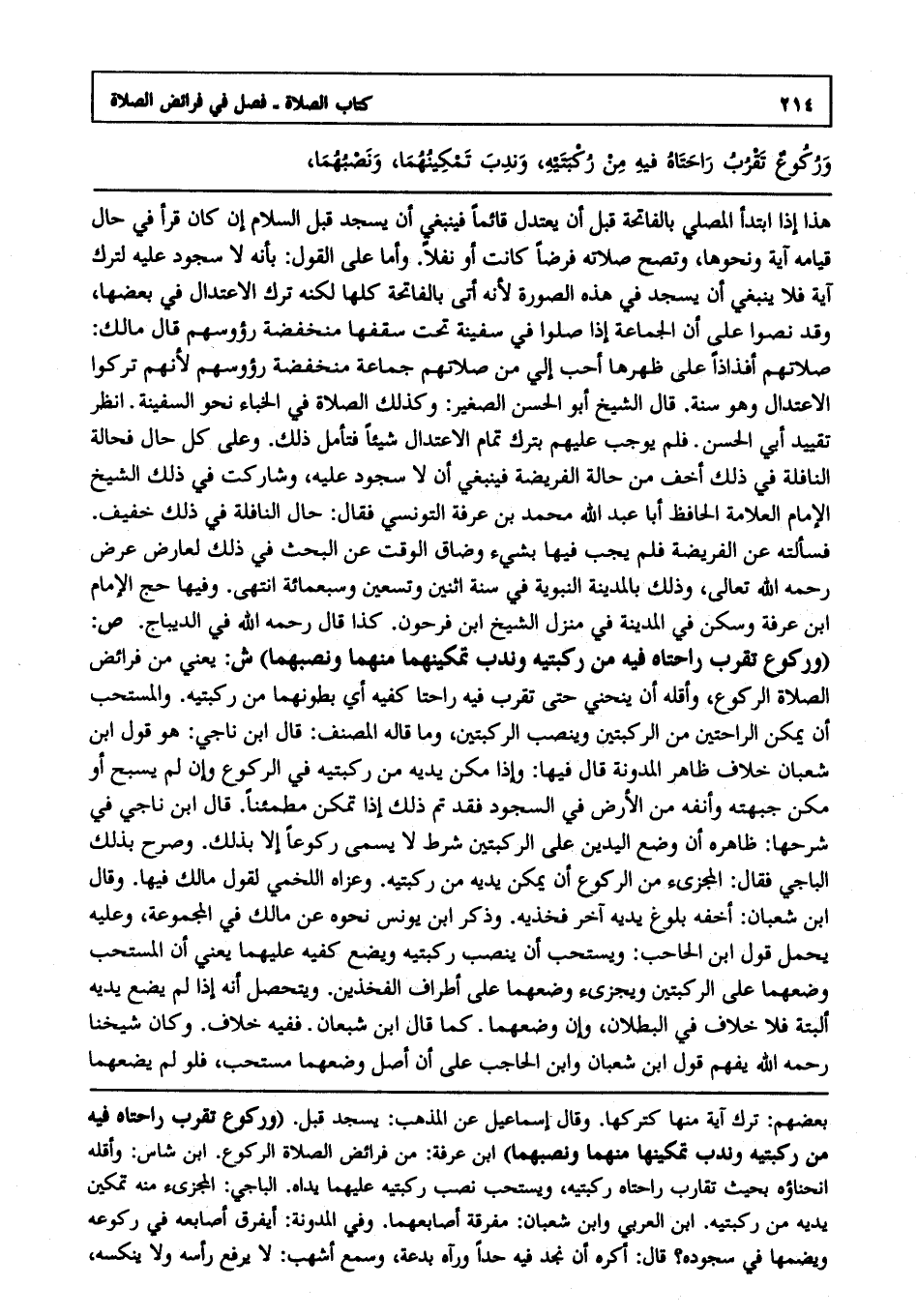 ص: "وركوع تقرب راحتاه فيه من ركبتيه وندب تمكينهما منهما ونصبهما" ش: يعني من فرائض الصلاة الركوع, وأقله أن ينحني حتى تقرب فيه راحتا كفيه أي بطونهما من ركبتيه والمستحب أن يمكن الراحتين من الركبتين وينصب الركبتين, وما قاله المصنف قال ابن ناجي هو قول ابن شعبان, خلاف ظاهر المدونة قال فيها: وإذا مكن يديه من ركبتيه في الركوع وإن لم يسبح أو مكن جبهته وأنفه من الأرض في السجود فقد تم ذلك إذا تمكن مطمئنا قال ابن ناجي في شرحها: ظاهره أن وضع اليدين على الركبتين شرط لا يسمى ركوعا إلا بذلك وصرح بذلك الباجي فقال المجزئ من الركوع أن يمكن يديه من ركبتيه, وعزاه اللخمي لقول مالك فيها, وقال ابن شعبان: أخفه بلوغ يديه آخر فخذيه به وذكر ابن يونس نحوه عن مالك في المجموعة وعليه يحمل قول ابن الحاجب ويستحب أن ينصب ركبتيه ويضع كفيه عليهما يعني أن المستحب وضعهما على الركبتين ويجزئ وضعهما على أطراف الفخذين, ويتحصل أنه إذا لم يضع يديه ألبتة فلا خلاف في البطلان وإن وضعهما كما قال ابن شعبان ففيه خلاف, وكان شيخنا رحمه الله يفهم قول ابن شعبان وابن الحاجب على أن أصل وضعهما مستحب فلو لم يضعهما
