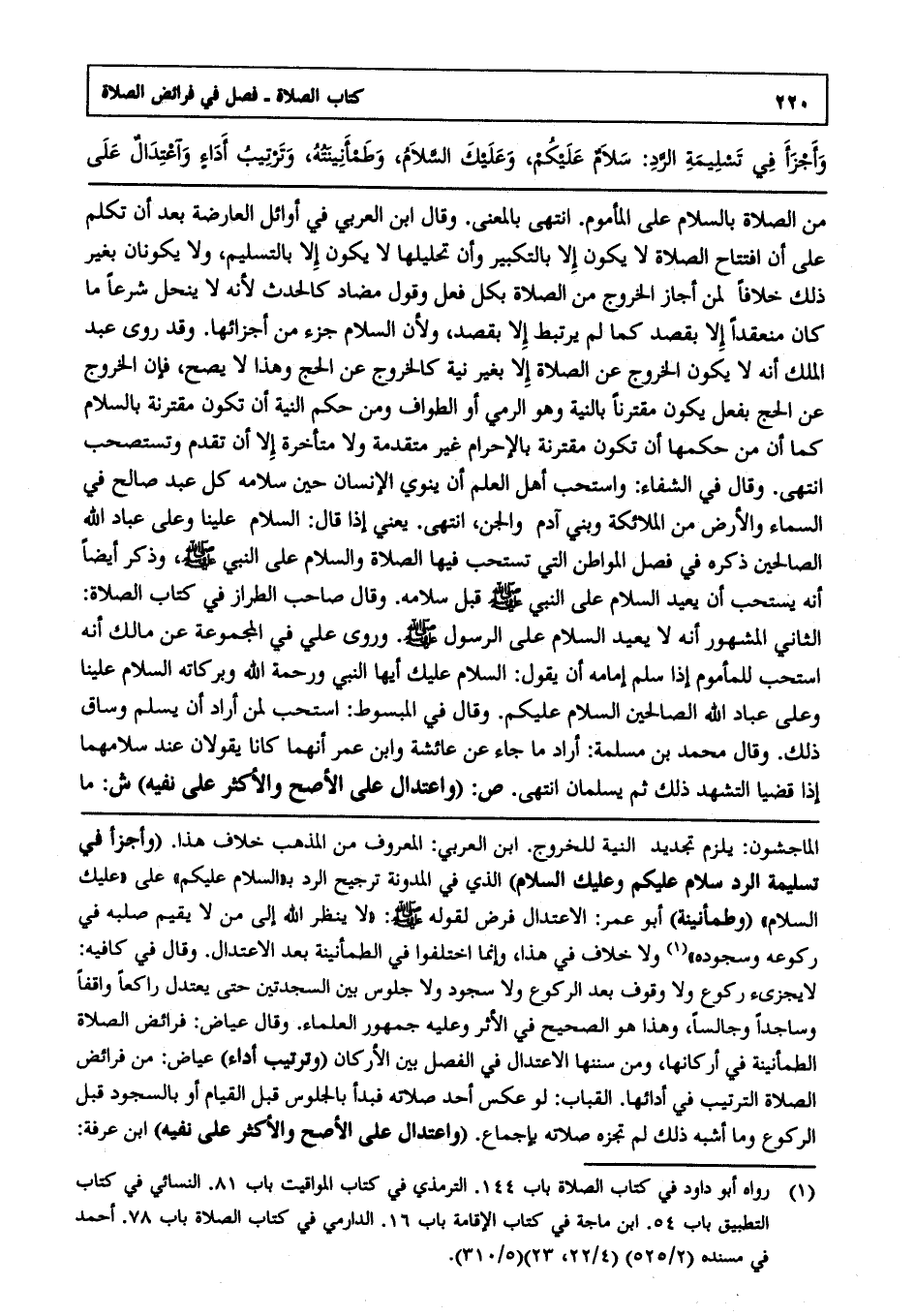 من الصلاة بالسلام على المأموم انتهى بالمعنى وقال ابن العربي في أوائل العارضة: بعد أن تكلم على أن افتتاح الصلاة لا يكون إلا بالتكبير وأن تحليلها لا يكون إلا بالتسليم ولا يكونان بغير ذلك, خلافا لمن أجاز الخروج من الصلاة بكل فعل وقول مضاد كالحدث ; لأنه لا ينحل شرعا ما كان منعقدا إلا بقصد كما لم يرتبط إلا بقصد ولأن السلام جزء من أجزائها, وقد روى عبد الملك أنه لا يكون الخروج عن الصلاة إلا بغير نية كالخروج عن الحج وهذا لا يصح فإن الخروج عن الحج بفعل يكون مقترنا بالنية وهو الرمي أو الطواف, ومن حكم النية أن تكون مقترنة بالسلام كما أن من حكمها أن تكون مقترنة بالإحرام غير متقدمة ولا متأخرة إلا أن تقدم وتستصحب, انتهى. وقال في الشفاء واستحب أهل العلم أن ينوي الإنسان حين سلامه كل عبد صالح في السماء والأرض من الملائكة وبني آدم والجن, انتهى. يعني إذا قال: السلام علينا وعلى عباد الله الصالحين, ذكره في فصل المواطن التي تستحب فيها الصلاة والسلام على النبي صلى الله عليه وسلم, وذكر أيضا أنه يستحب أن يعيد السلام على النبي صلى الله عليه وسلم قبل سلامه, وقال صاحب الطراز في كتاب الصلاة الثاني: المشهور أنه لا يعيد السلام على الرسول صلى الله عليه وسلم. وروى علي في المجموعة عن مالك أنه استحب للمأموم إذا سلم إمامه أن يقول: السلام عليك أيها النبي ورحمة الله وبركاته السلام علينا وعلى عباد الله الصالحين السلام عليكم. وقال في المبسوط استحب لمن أراد أن يسلم وساق ذلك وقال محمد بن مسلمة: أراد ما جاء عن عائشة وابن عمر أنهما كانا يقولان عند سلامهما إذا قضيا التشهد ذلك ثم يسلمان, انتهى.
