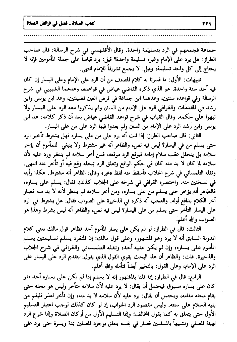 الثاني : قال صاحب الطراز: إذا ثبت أنه يرد على من على يساره فهل يشترط تأخير الرد حتى يسلم من في اليسار ليس فيه نص والظاهر أنه غير مشترط ولا ينبغي للمأموم أن يؤخر سلامه بل يتحلل عقب سلام إمامه فيوقع الرد موقعه, فمن أخر سلامه لم ينتظر ورد عليه ; لأن سلامه لما كان لا بد منه كان في حكم الواقع, وتعلق الرد بمحله وقع فيه أو تأخر عنه, انتهى. ونقله التلمساني في شرح الجلاب فأسقط منه لفظ " غير " وقال: الظاهر أنه مشترط هكذا رأيت في نسختين منه واختصره القرافي في شرحه على الجلاب كذلك فقال: يسلم على يساره. فالظاهر أنه يؤخر حتى يسلم من على يساره, ومن أخر سلامه لم ينتظر ; لأنه لا بد منه فصار آخر الكلام يدافع أوله, والعجب أنه ذكره في الذخيرة على الصواب فقال: هل يشترط في الرد على اليسار التأخر حتى يسلم من على اليسار ؟ ليس فيه نص والظاهر أنه ليس بشرط وهذا هو الصواب, والله أعلم.