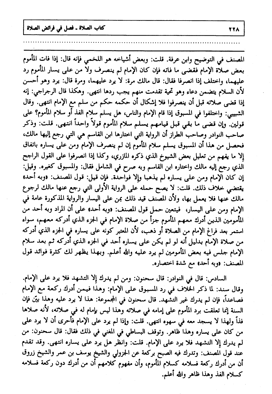 السادس : قال في النوادر: قال سحنون: ومن لم يدرك إلا التشهد فلا يرد على الإمام. وقال سند: لما ذكر الخلاف في رد المسبوق على الإمام وهذا فيمن أدرك ركعة مع الإمام فصاعدا, فإن لم يدرك غير التشهد قال سحنون في المجموعة: هذا لا يرد عليه وهذا بين, فإن السنة إنما تعلقت برد المأموم على إمامه في صلاته وهذا ليس بإمام له في صلاته ; لأنه صلاها فذا ولهذا لا يسجد معه في سهوه انتهى. قلت: وإذا لم يرد على الإمام فأحرى أن لا يرد على من كان على يساره وهذا ظاهر. وتوقف البساطي في المغني في ذلك فقال: قال سحنون: ومن لم يدرك إلا التشهد فلا يرد على الإمام. قلت: وانظر هل يرد على يساره ؟ انتهى وقد تقدم عند قول المصنف: وتدرك فيه الصبح بركعة. عن الجزولي والشيخ يوسف بن عمر والشيخ زروق أن من أدرك ركعة فسلامه كسلام المأموم, وأن مفهوم كلامهم أن من أدرك دون ركعة فسلامه كسلام الفذ وهذا ظاهر, والله أعلم.