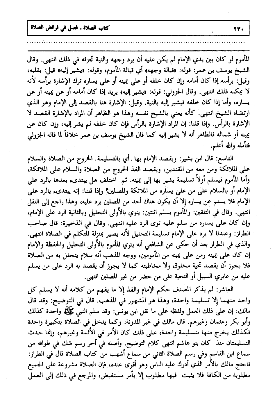 العاشر : لم يذكر المصنف حكم الإمام والفذ إلا ما يفهم من كلامه أنه لا يسلم كل واحد منها إلا تسليمة واحدة وهذا هو المشهور في المذهب. قال في التوضيح: وقد قال مالك: إن على ذلك العمل, ولفظه على ما نقل ابن يونس وقد سلم النبي صلى الله عليه وسلم واحدة كذلك وأبو بكر وعثمان وغيرهم. قال مالك في غير المدونة: وكما يدخل في الصلاة بتكبيرة واحدة فكذلك يخرج منها بتسليمة واحدة على ذلك كان الأمر في الأئمة وغيرهم وإنما حدث التسليمتان منذ كان بنو هاشم, انتهى كلام التوضيح وأصله في آخر رسم شك في طوافه من سماع ابن القاسم وفي رسم الصلاة الثاني من سماع أشهب من كتاب الصلاة. قال في الطراز: فاحتج مالك بالأمر الذي أدرك عليه الناس وهو أقوى عنده فإن الصلاة مشروعة على الجميع مطلوبة من الكافة فلا يثبت فيها مطلوب إلا بأمر مستفيض, والمرجع في ذلك إلى العمل