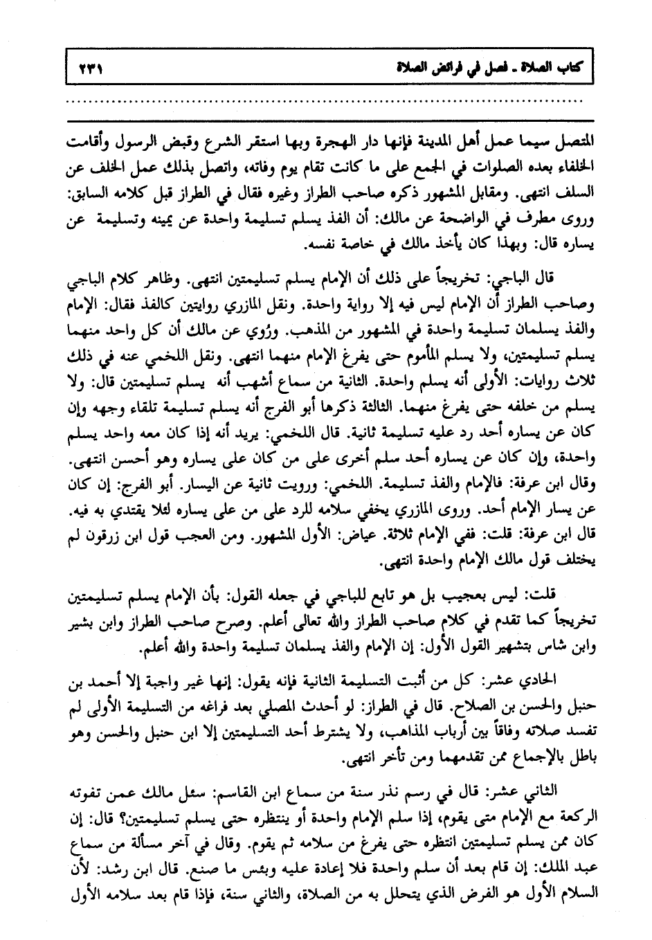 قلت: ليس بعجيب بل هو تابع للباجي في جعله القول بأن الإمام يسلم تسليمتين تخريجا كما تقدم في كلام صاحب الطراز, والله تعالى أعلم. وصرح صاحب الطراز وابن بشير وابن شاس بتشهير القول الأول أن الإمام والفذ يسلمان تسليمة واحدة, والله أعلم.