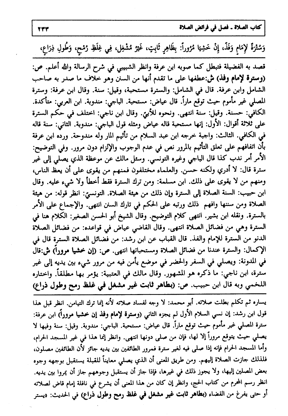 ص: "وسترة لإمام وفذ" ش: عطفها على ما تقدم أنها من السنن وهو خلاف ما صدر به صاحب الشامل وابن عرفة قال في الشامل: والسترة مستحبة وقيل: سنة وقال ابن عرفة وسترة المصلي غير مأموم حيث توقع مارا, قال عياض: مستحبة. الباجي: مندوبة. ابن العربي: متأكدة. الكافي: حسنة. وقيل: سنة. انتهى ونحوه للأبي وقال ابن ناجي: اختلف في حكم السترة على ثلاثة أقوال: الأول أنها مستحبة قاله عياض ومثله قول الباجي: مندوبة. الثاني سنة قاله في الكافي. الثالث واجبة خرجه ابن عبد السلام من تأثيم المار وله مندوحة ورده ابن عرفة بأن اتفاقهم على تعلق التأثيم بالمرور نص في عدم الوجوب وإلا لزم دون مرور وفي التوضيح الأمر أمر ندب كذا قال الباجي وغيره التونسي, وسئل مالك عن موعظة الذي يصلي إلى غير سترة قال: لا أدري ولكنه حسن. والعلماء مختلفون فمنهم من يقوى على أن يعظ الناس, ومنهم من لا يقوى على ذلك ابن مسلمة, ومن ترك السترة فقد أخطأ ولا شيء عليه, وقال ابن حبيب: السنة الصلاة إلى السترة وأن ذلك من هيئة الصلاة التونسي انظر قوله: من هيئة الصلاة, ومن سننها وافهم ذلك ورتبه على الحكم في تارك السنن, انتهى. والإجماع على الأمر بالسترة ونقله ابن بشير انتهى كلام التوضيح. وقال الشيخ أبو الحسن الصغير: الكلام هنا في السترة وهي من فضائل الصلاة انتهى. وقال القاضي عياض في قواعده: من فضائل الصلاة الدنو من السترة للإمام والفذ. قال القباب عن ابن رشد من فضائل الصلاة السترة قال في الإكمال والسترة عندنا من فضائل الصلاة ومستحباتها انتهى.