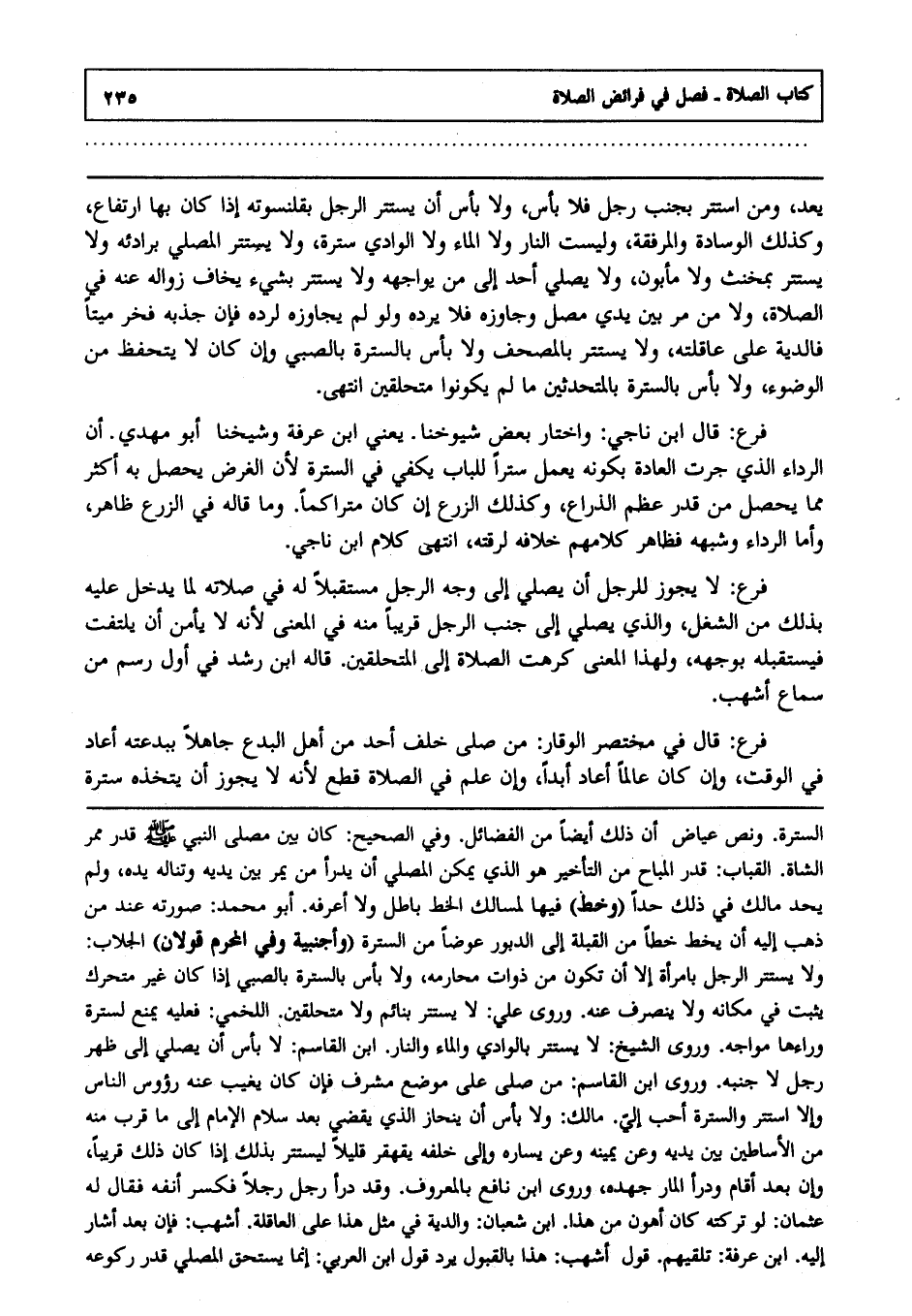 يعد, ومن استتر بجنب رجل فلا بأس ولا بأس أن يستتر الرجل بقلنسوته إذا كان بها ارتفاع وكذلك الوسادة والمرفقة وليست النار ولا الماء ولا الوادي سترة ولا يستتر المصلي بردائه ولا يستتر بمخنث ولا مأبون ولا يصلي أحد إلى من يواجهه, ولا يستتر بشيء يخاف زواله عنه في الصلاة ولا من مر بين يدي مصل وجاوزه فلا يرده ولو لم يجاوزه لرده فإن جذبه فخر ميتا فالدية على عاقلته ولا يستتر بالمصحف ولا بأس بالسترة بالصبي, وإن كان لا يتحفظ من الوضوء ولا بأس بالسترة بالمتحدثين ما لم يكونوا متحلقين, انتهى.