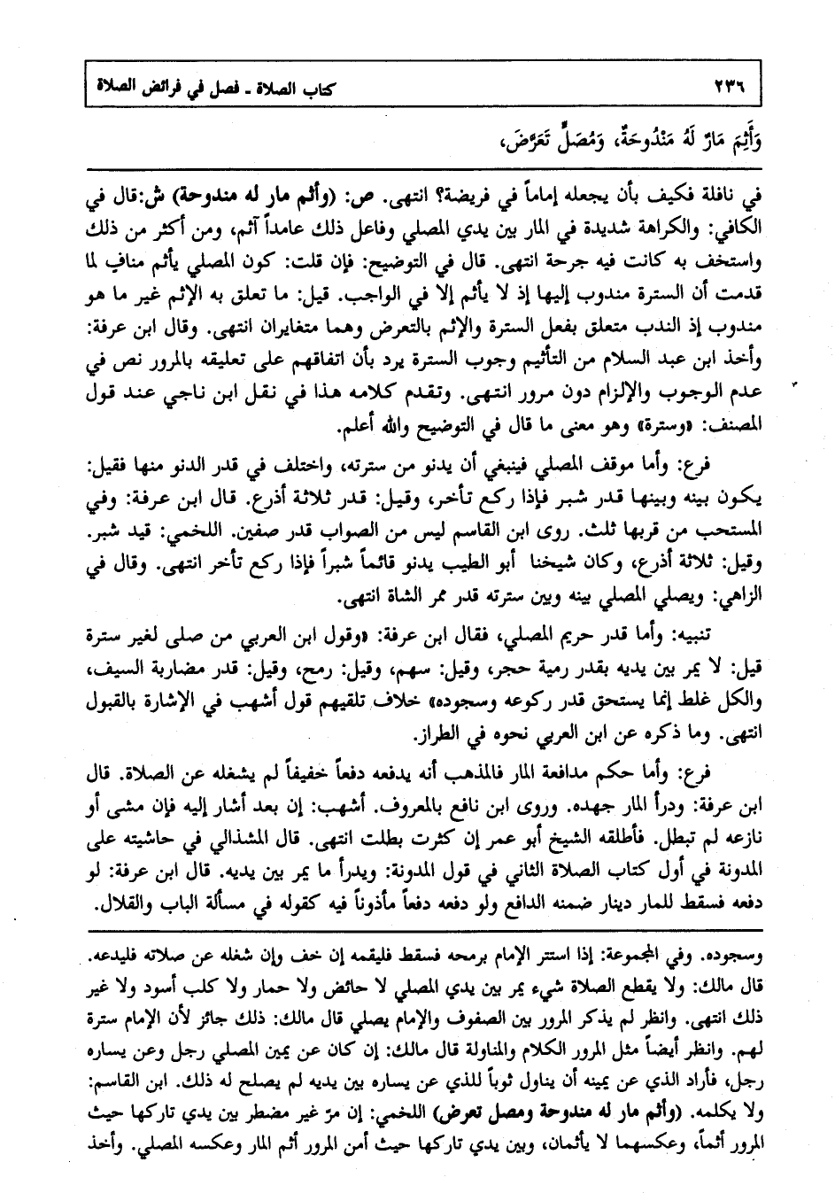 فرع : وأما حكم مدافعة المار فالمذهب أنه يدفعه دفعا خفيفا لم يشغله عن الصلاة, قال ابن عرفة: ودرء المار جهده وروى ابن نافع بالمعروف أشهب إن بعد أشار إليه فإن مشى أو نازعه لم تبطل فأطلقه الشيخ أبو عمر إن كثرت بطلت انتهى قال المشذالي: في حاشيته على المدونة في أول كتاب الصلاة الثاني في قول المدونة: ويدرأ ما يمر بين يديه قال ابن عرفة: لو دفعه فسقط للمار دينار ضمنه الدافع ولو دفعه دفعا مأذونا فيه كقولها في مسألة الباب والقلال.