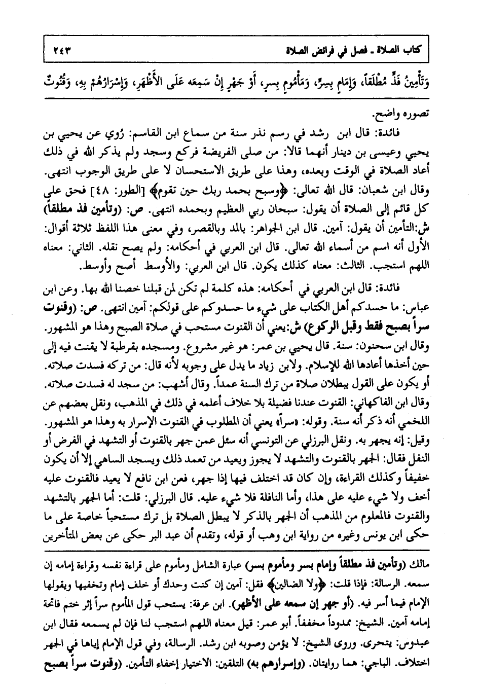 ص: وقنوت سرا بصبح فقط وقبل الركوع" ش:يعني أن القنوت مستحب في صلاة الصبح وهذا هو المشهور وقال ابن سحنون: سنة. قال يحيى بن عمر هو غير مشروع ومسجده بقرطبة لا يقنت فيه إلى حين أخذها أعادها الله للإسلام ولابن زياد ما يدل على وجوبه ; لأنه قال من تركه فسدت صلاته أو يكون على القول ببطلان صلاة من ترك السنة عمدا, وقال أشهب: من سجد له فسدت صلاته, وقال ابن الفاكهاني: القنوت عندنا فضيلة بلا خلاف أعلمه في ذلك في المذهب ونقل بعضهم عن اللخمي أنه ذكر أنه سنة وقوله: سرا, يعني أن المطلوب في القنوت الإسرار به وهذا هو المشهور وقيل: إنه يجهر به, ونقل البرزلي عن التونسي أنه سئل عمن جهر بالقنوت أو التشهد في الفرض أو النفل فقال: الجهر بالقنوت والتشهد لا يجوز ويعيد من تعمد ذلك ويسجد الساهي إلا أن يكون خفيفا وكذلك القراءة وإن كان قد اختلف فيها إذا جهر فعن ابن نافع: لا يعيد فالقنوت عليه أخف ولا شيء عليه على هذا وأما النافلة فلا شيء عليه. قال البرزلي:. قلت: أما الجهر بالتشهد والقنوت فالمعلوم من المذهب أن الجهر بالذكر لا يبطل الصلاة بل ترك مستحبا خاصة على ما حكى ابن يونس وغيره من رواية ابن وهب أو قوله, وتقدم أن ابن عبد البر حكى عن بعض المتأخرين