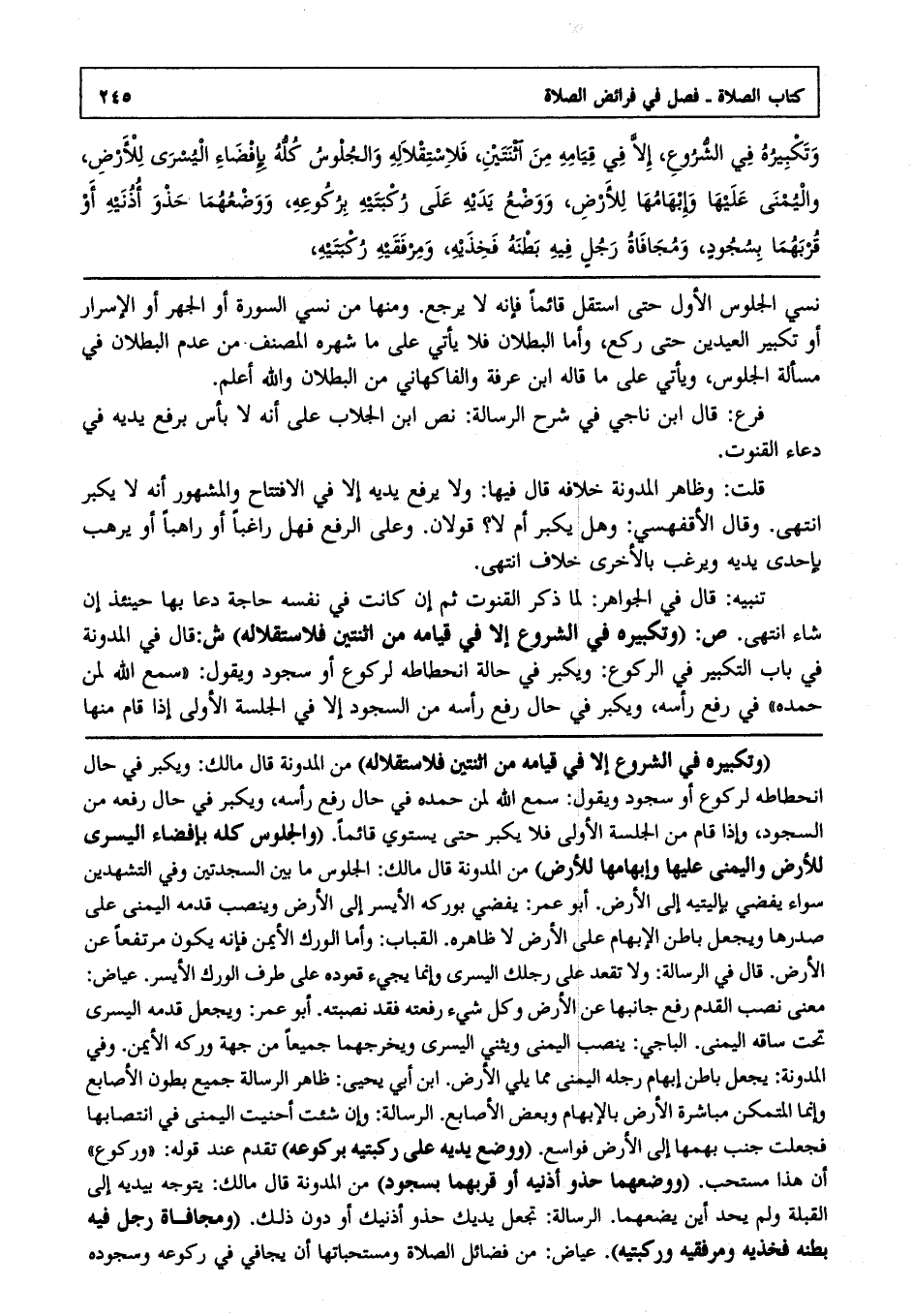 وتكبيره في الشروع إلا في قيامه من اثنتين فلاستقلاله والجلوس كله بإفضاء اليسرى للأرض ولليمنى عليها وإبهامها للأرض ووضع يديه على ركبتيه بركوعه ووضعهما حذو أذنيه أو قربهما بسجود ومجافاة رجل فيه بطنه فخذيه ومرفقيه ركبتيه