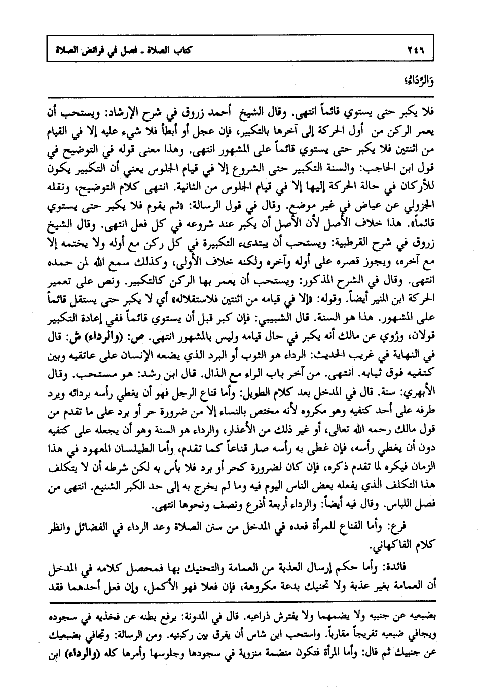 ص: "والرداء" ش: قال في النهاية في غريب الحديث: الرداء هو الثوب أو البرد الذي يضعه الإنسان على عاتقيه وبين كتفيه فوق ثيابه انتهى من آخر باب الراء مع الدال. قال ابن رشد: وهو مستحب, وقال الأبهري: سنة. قال في المدخل بعد كلام طويل وأما قناع الرجل فهو أن يغطي رأسه بردائه ويرد طرفه على أحد كتفيه وهو مكروه ; لأنه مختص بالنساء إلا من ضرورة حر أو برد على ما تقدم من قول مالك رحمه الله تعالى أو غير ذلك من الأعذار والرداء هو السنة وهو أن يجعله على كتفيه دون أن يغطي رأسه فإن غطى به رأسه صار قناعا كما تقدم, وأما الطيلسان المعهود في هذا الزمان فيكره لما تقدم ذكره فإن كان لضرورة كحر أو برد فلا بأس به لكن شرطه أن لا يتكلف هذا التكلف الذي يفعله بعض الناس اليوم فيه وما لم يخرج به إلى حد الكبر الشنيع انتهى. من فصل اللباس وقال فيه أيضا: والرداء أربعة أذرع ونصف ونحوها انتهى. فرع: وأما القناع للمرأة فعده في المدخل من سنن الصلاة وعد الرداء في الفضائل وانظر كلام الفاكهاني
