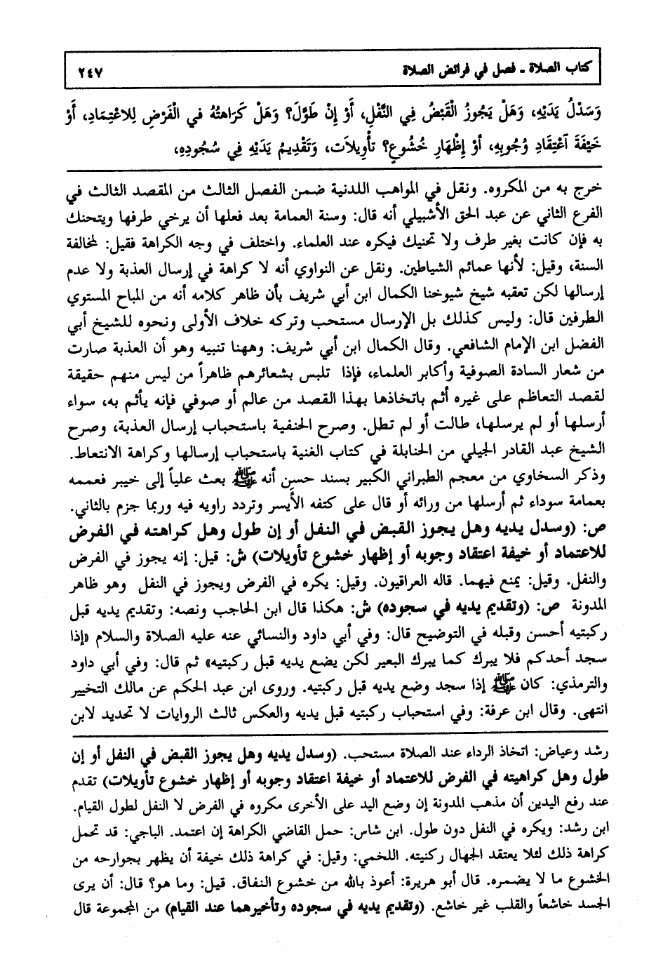 ص: "وسدل يديه وهل يجوز القبض في النفل أو إن طول وهل كراهته في الفرض للاعتماد أو خيفة اعتقاد وجوبه أو إظهار خشوع تأويلات" ش: قيل: إنه يجوز في الفرض والنفل, وقيل: يمنع فيهما قاله العراقيون, وقيل: يكره في الفرض ويجوز في النفل وهو ظاهر المدونة.