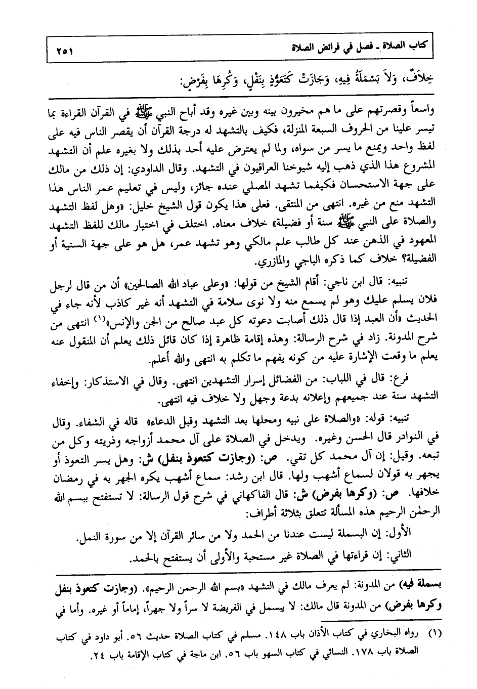 ص: "وكرها بفرض" ش: قال الفاكهاني في شرح قول الرسالة: لا تستفتح ببسم الله الرحمن الرحيم, هذه المسألة تتعلق بثلاثة أطراف: