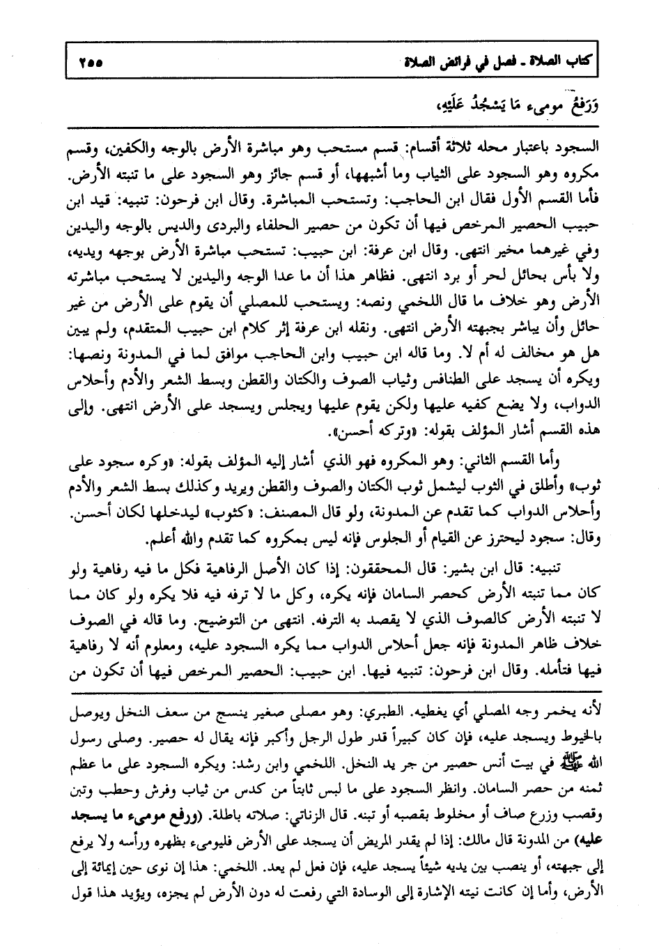 تنبيه : قال ابن بشير: قال المحققون: إذا كان الأصل الرفاهية فكل ما فيه رفاهية ولو كان مما تنبته الأرض كحصر السامان فإنه يكره وكل ما لا ترفه فيه فلا يكره ولو كان مما لا تنبته الأرض كالصوف الذي لا يقصد به الترفه, انتهى. من التوضيح وما قاله في الصوف خلاف ظاهر المدونة فإنه جعل أحلاس الدواب مما يكره السجود عليه ومعلوم أنه لا رفاهية فيها فتأمله, وقال ابن فرحون تنبيه فيها ابن حبيب الحصير المرخص فيها أن تكون من