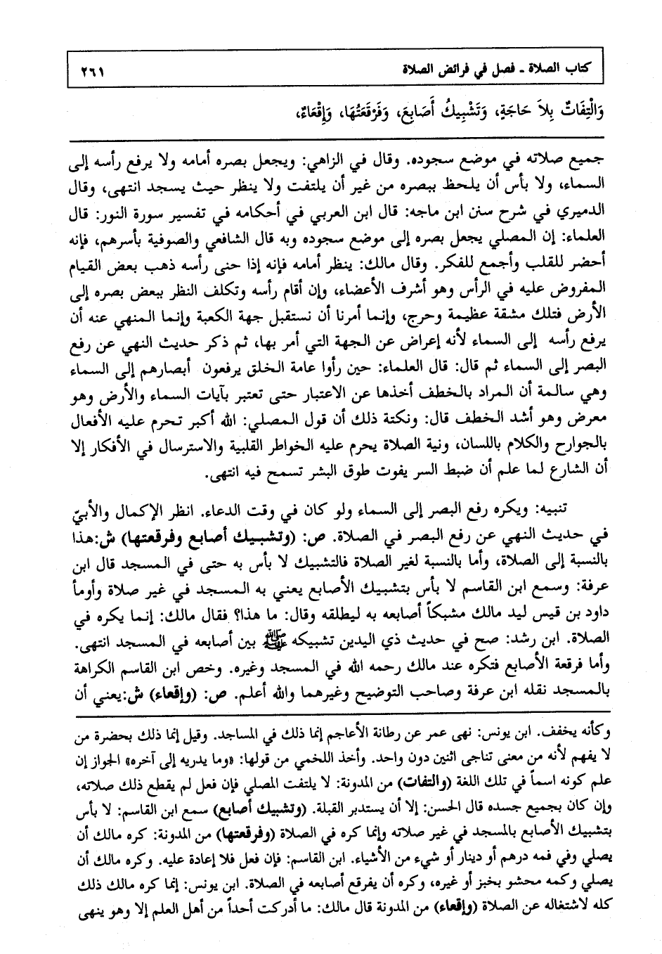 ص: "وتشبيك أصابع وفرقعتها" ش: هذا بالنسبة إلى الصلاة وأما بالنسبة لغير الصلاة فالتشبيك لا بأس به حتى في المسجد. قال ابن عرفة: وسمع ابن القاسم لا بأس بتشبيك الأصابع يعني به المسجد في غير صلاة وأومأ داود بن قيس ليد مالك مشبكا أصابعه به ليطلقه وقال: ما هذا ؟ فقال مالك: إنما يكره في الصلاة ابن رشد صح في حديث ذي اليدين تشبيكه صلى الله عليه وسلم بين أصابعه في المسجد انتهى وأما فرقعة الأصابع فتكره عند مالك رحمه الله في المسجد وغيره وخص ابن القاسم الكراهة بالمسجد نقله ابن عرفة وصاحب التوضيح وغيرهما, والله أعلم.