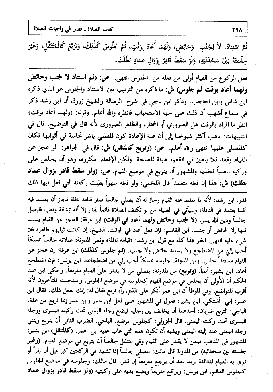 ص: "ثم استناد لا لجنب وحائض ولهما أعاد بوقت ثم جلوس" ش: ما ذكره من الترتيب بين الاستناد والجلوس هو الذي ذكره ابن شاس وابن الحاجب وذكر ابن ناجي في شرح الرسالة والشيخ زروق أن ابن رشد ذكر في سماع أشهب أن ذلك على جهة الاستحباب فانظره والله أعلم. وقوله ولهما أعاد بوقت انظر ما المراد بالوقت هل الضروري أو المختار ؟ والظاهر الضروري ; لأنه قال في التوضيح: قال في التنبيهات: ذهب أكثر شيوخنا إلى أن علة الإعادة كون المصلي باشر نجاسة في أثوابها فكان كالمصلي عليها, انتهى. والله أعلم.