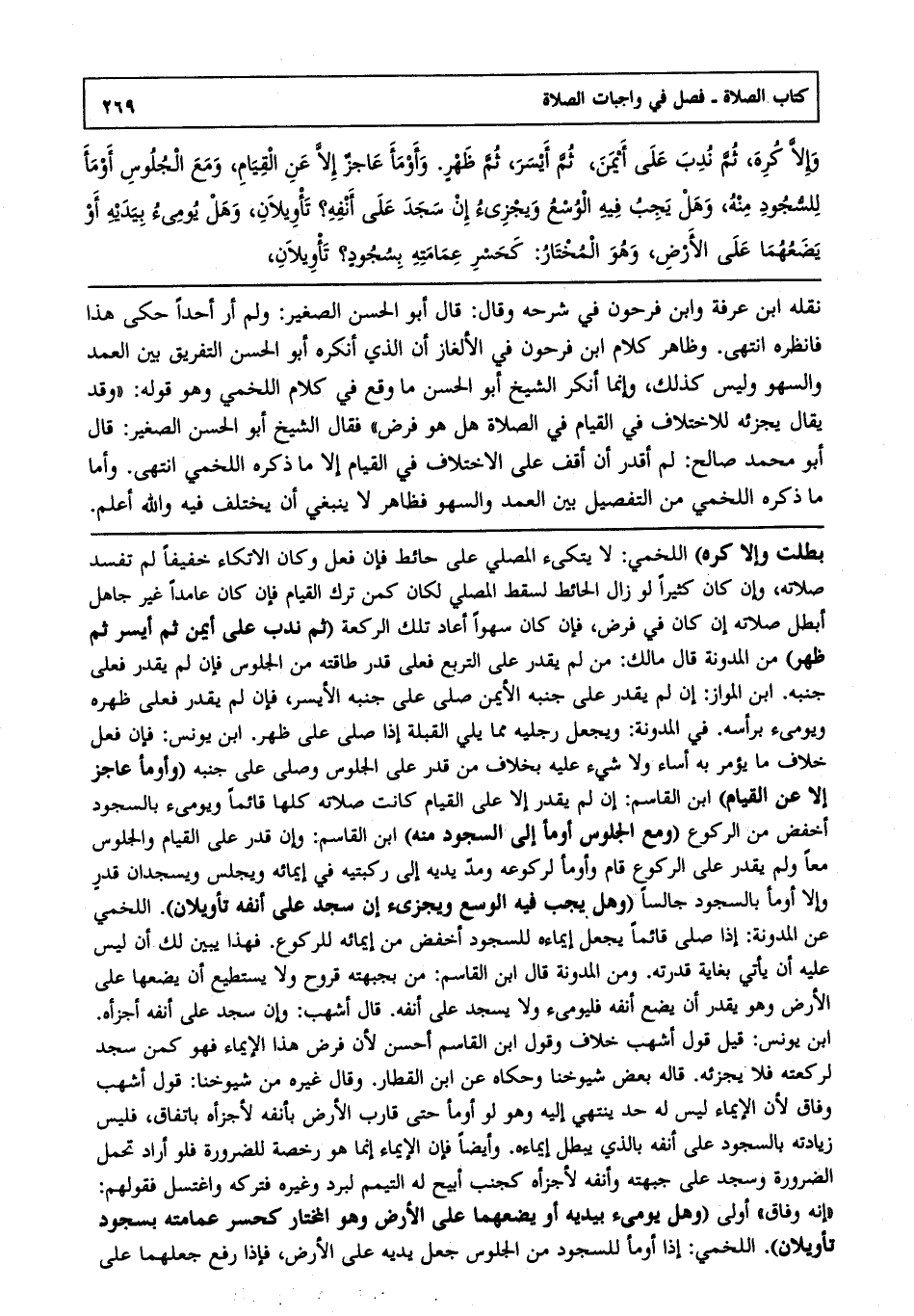 نقله ابن عرفة وابن فرحون في شرحه وقال: قال أبو الحسن الصغير: ولم أر أحدا حكى هذا فانظره انتهى. وظاهر كلام ابن فرحون في الألغاز أن الذي أنكره أبو الحسن التفريق بين العمد والسهو وليس كذلك وإنما أنكر الشيخ أبو الحسن ما وقع في كلام اللخمي وهو قوله. وقد يقال: يجزئه ; للاختلاف في القيام في الصلاة هل هو فرض فقال الشيخ أبو الحسن الصغير: قال أبو محمد صالح: لم أقدر أن أقف على الاختلاف في القيام إلا ما ذكره اللخمي, انتهى. وأما ما ذكره اللخمي من التفصيل بين العمد والسهو فظاهر لا ينبغي أن يختلف فيه والله أعلم
