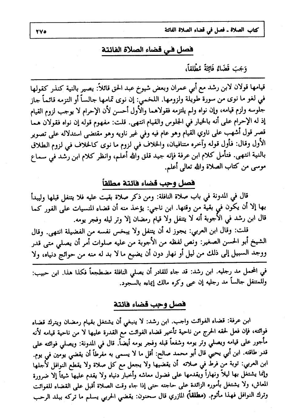 قال في المدونة في باب صلاة النافلة: " ومن ذكر صلاة بقيت عليه فلا يتنفل قبلها وليبدأ بها إلا أن يكون في بقية من وقتها " ابن ناجي يؤخذ منه أن قضاء المنسيات على الفور كما قال ابن رشد في الأجوبة إنه لا يتنفل ولا قيام رمضان إلا وتر ليله وفجر يومه. قلت: وقال ابن العربي: يجوز له أن يتنفل ولا يبخس نفسه من الفضيلة, انتهى. وقال الشيخ أبو الحسن الصغير ونص لفظه من الأجوبة من عليه صلوات أمر أن يصلي متى قدر ووجد السبيل إلى ذلك من ليل أو نهار دون أن يضيع ما لا بد له منه من حوائج دنياه ولا