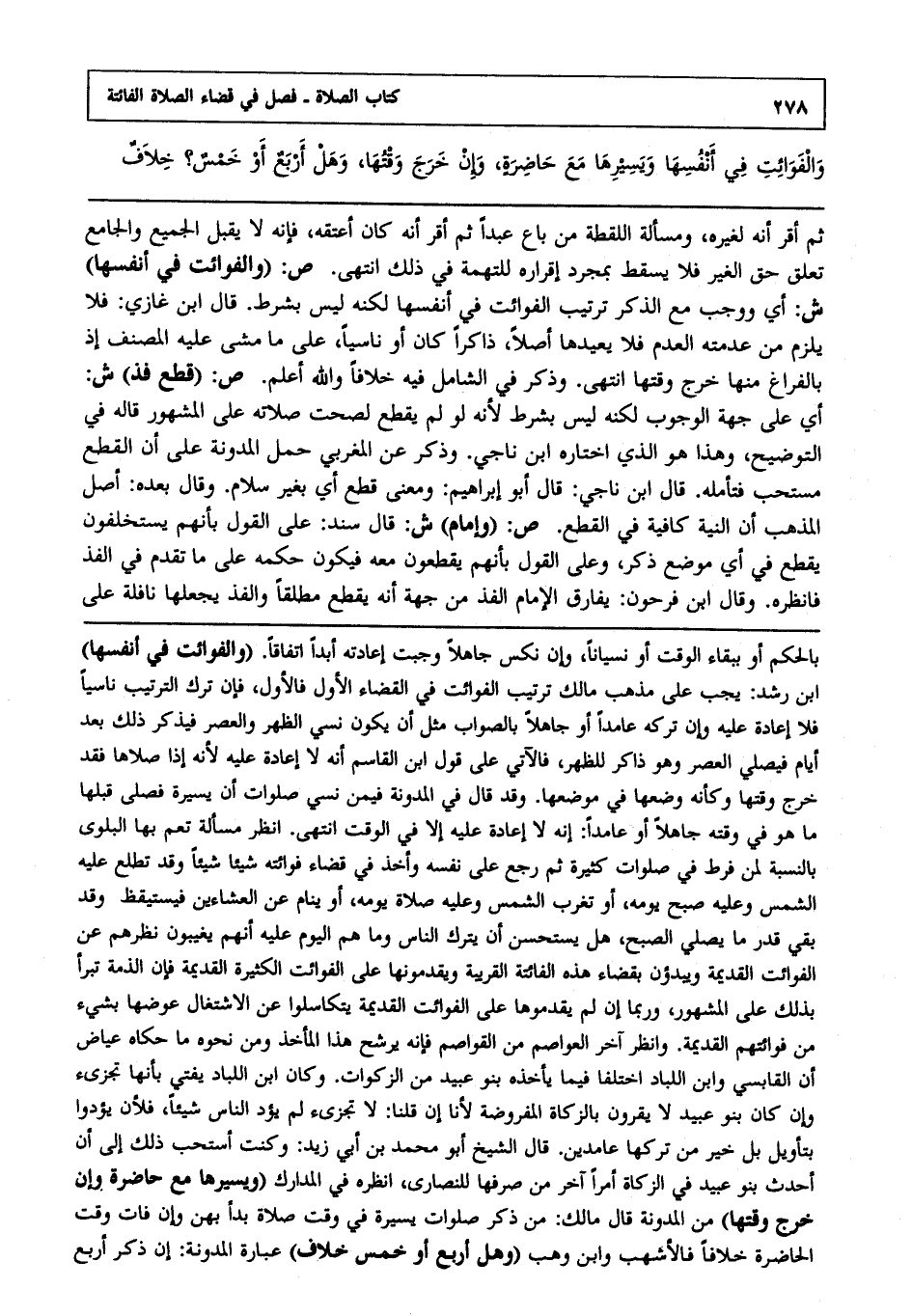 ص: "والفوائت في أنفسها" ش: أي ووجب مع الذكر ترتيب الفوائت في أنفسها لكنه ليس بشرط قال ابن غازي فلا يلزم من عدمه العدم فلا يعيدها أصلا ذاكرا كان أو ناسيا على ما مشى عليه المصنف إذ بالفراغ منها خرج وقتها انتهى. وذكر في الشامل فيه خلافا والله أعلم.